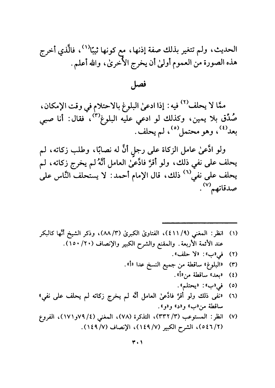 (¬٧) انظر: المستوعب (٣/ ٣٣٢)، التذكرة (٧٨)، المغني (٤/ ٧٩ و ١٧١)، الفروع (٢/ ٥٤٦)، الشرح الكبير (٧/ ١٤٩)، الإنصاف (٧/ ١٤٩).