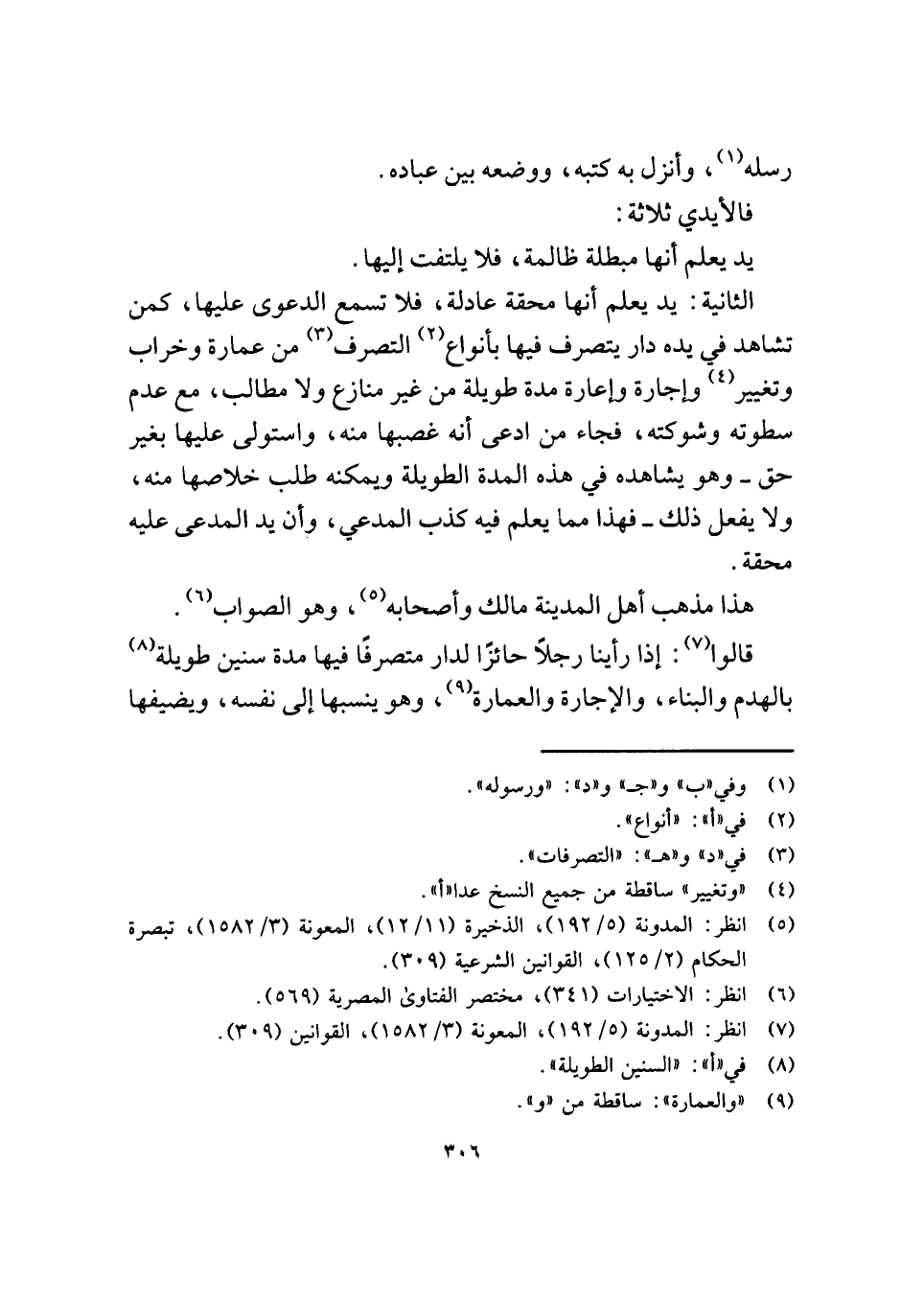 الثانية: يد يعلم أنها محقة عادلة، فلا تسمع الدعوى عليها، كمن تشاهد في يده دار يتصرف فيها بأنواع (¬٢) التصرف (¬٣) من عمارة وخراب وتغيير (¬٤) وإجارة وإعارة مدة طويلة من غير منازع ولا مطالب، مع عدم سطوته وشوكته، فجاء من ادعى أنه غصبها منه، واستولى عليها بغير حق - وهو يشاهده في هذه المدة الطويلة ويمكنه طلب خلاصها منه، ولا يفعل ذلك - فهذا مما يعلم فيه كذب المدعي، وأن يد المدعى عليه محقة.