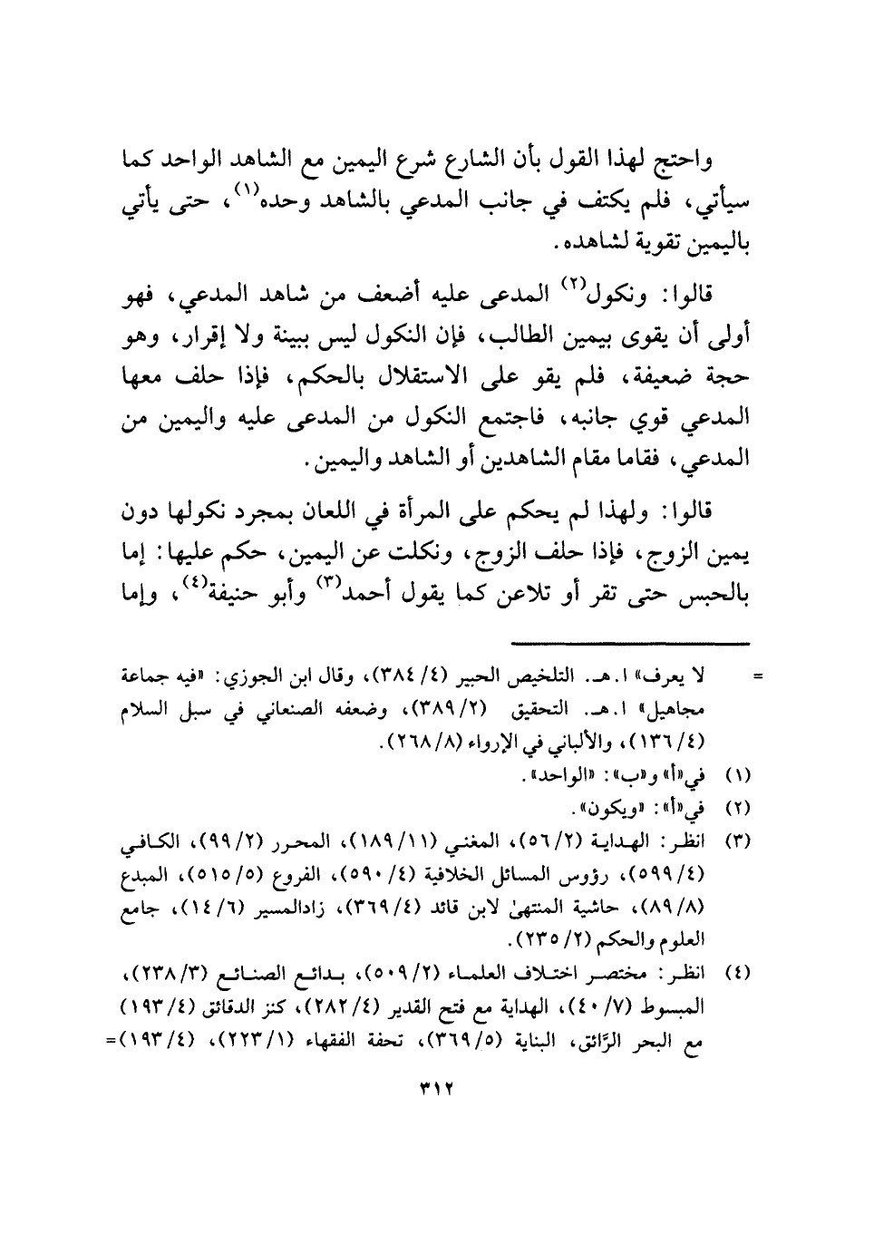 قالوا: ولهذا لم يحكم على المرأة في اللعان بمجرد نكولها دون يمين الزوج، فإذا حلف الزوج، ونكلت عن اليمين، حكم عليها: إما بالحبس حتى تقر أو تلاعن كما يقول أحمد (¬٣) وأبو حنيفة (¬٤)، وإما