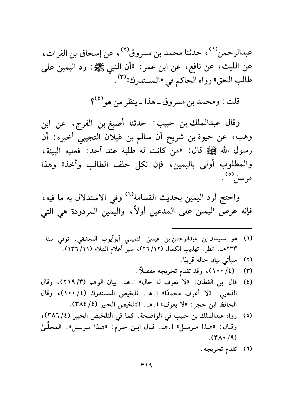 عبد الرحمن (¬١)، حدثنا محمد بن مسروق (¬٢)، عن إسحاق بن الفرات، عن الليث، عن نافع، عن ابن عمر: "أن النبي - صلى الله عليه وسلم -: رد اليمين على طالب الحق" رواه الحاكم في "المستدرك" (¬٣).