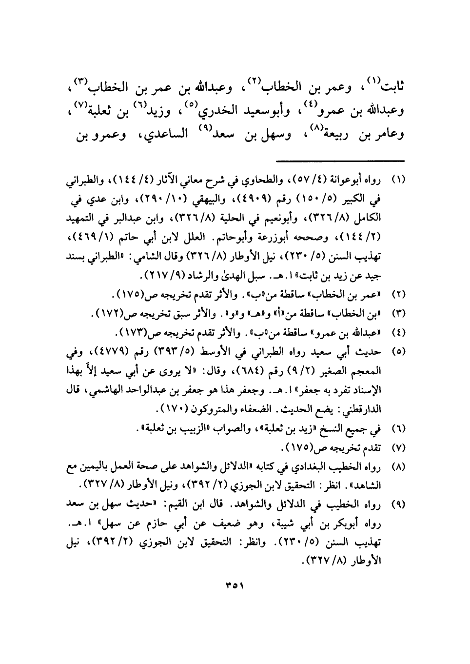 (¬١) رواه أبو عوانة (٤/ ٥٧)، والطحاوي في شرح معاني الآثار (٤/ ١٤٤)، والطبراني في الكبير (٥/ ١٥٠) رقم (٤٩٠٩)، والبيهقي (١٠/ ٢٩٠)، وابن عدي في الكامل (٨/ ٣٢٦)، وأبو نعيم في الحلية (٨/ ٣٢٦)، وابن عبد البر في التمهيد (٢/ ١٤٤)، وصححه أبو زرعة وأبو حاتم. العلل لابن أبي حاتم (١/ ٤٦٩)، تهذيب السنن (٥/ ٢٣٠)، نيل الأوطار (٨/ ٣٢٦) وقال الشامي: "الطبراني بسند جيد عن زيد بن ثابت" ا. هـ. سبل الهدى والرشاد (٩/ ٢١٧).