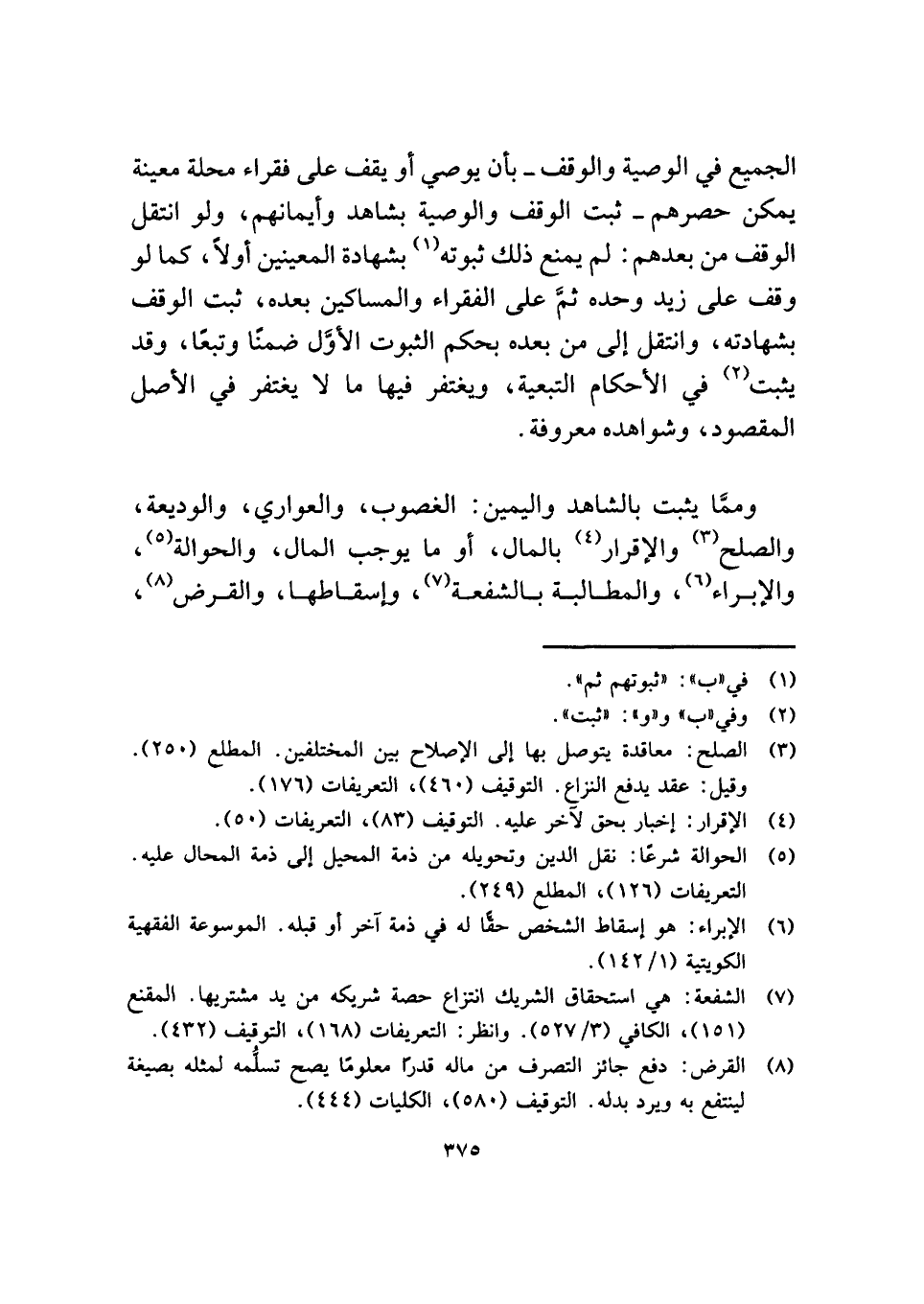 الجميع في الوصية والوقف - بأن يوصي أو يقف على فقراء محلة معينة يمكن حصرهم - ثبت الوقف والوصية بشاهد وأيمانهم، ولو انتقل الوقف من بعدهم: لم يمنع ذلك ثبوته (¬١) بشهادة المعينين أولًا، كما لو وقف على زيد وحده ثمَّ على الفقراء والمساكين بعده، ثبت الوقف بشهادته، وانتقل إلى من بعده بحكم الثبوت الأوَّل ضمنًا وتبعًا، وقد يثبت (¬٢) في الأحكام التبعية، ويغتفر فيها ما لا يغتفر في الأصل المقصود، وشواهده معروفة.