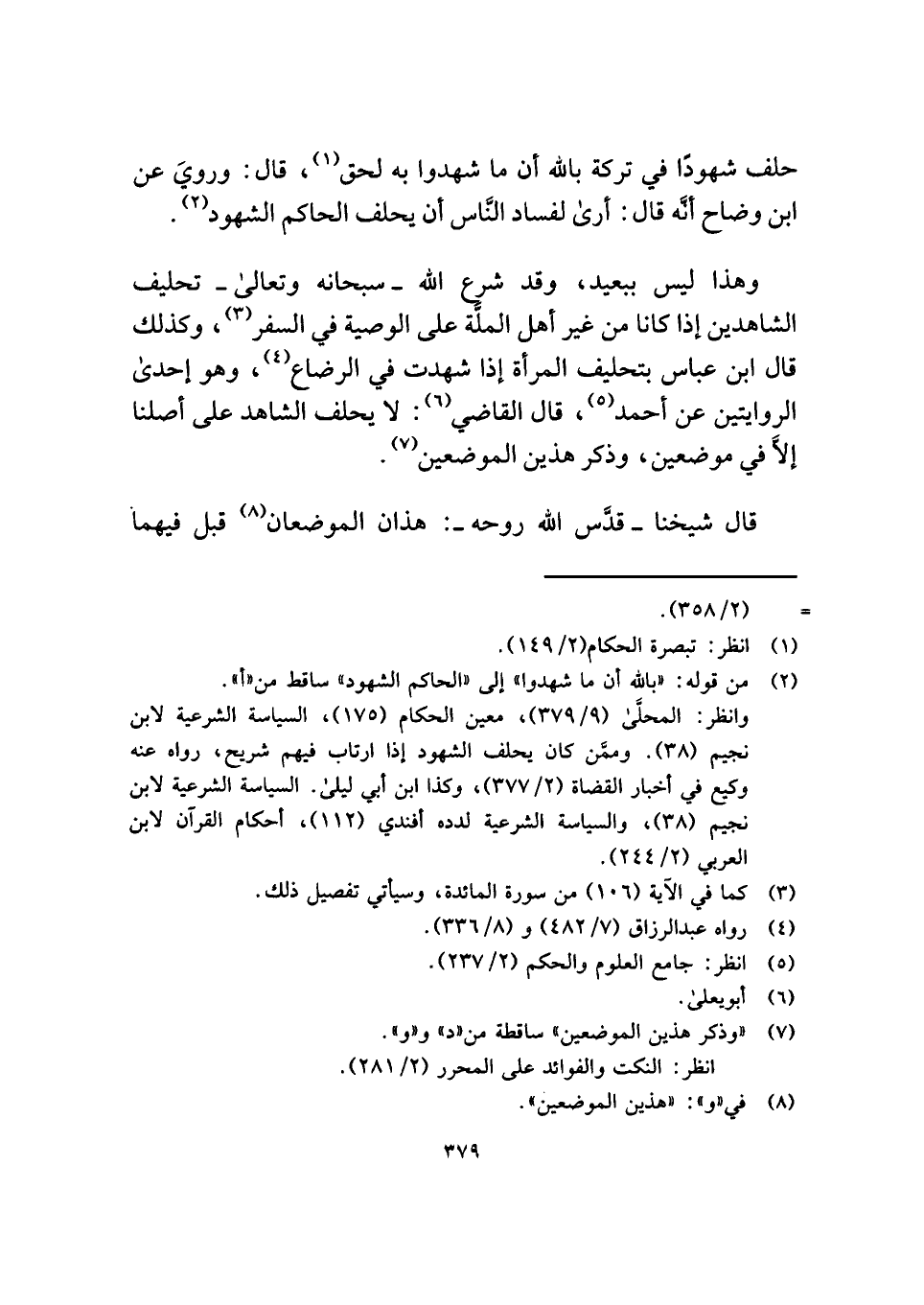 وهذا ليس ببعيد، وقد شرِع الله - سبحانه وتعالى - تحليف الشاهدين إذا كانا من غير أهل الملَّة على الوصية في السفر (¬٣)، وكذلك قال ابن عباس بتحليف المرأة إذا شهدت في الرضاع (¬٤)، وهو إحدى الروايتين عن أحمد (¬٥)، قال القاضي (¬٦): لا يحلف الشاهد على أصلنا إلَّا في موضعين، وذكر هذين الموضعين (¬٧).