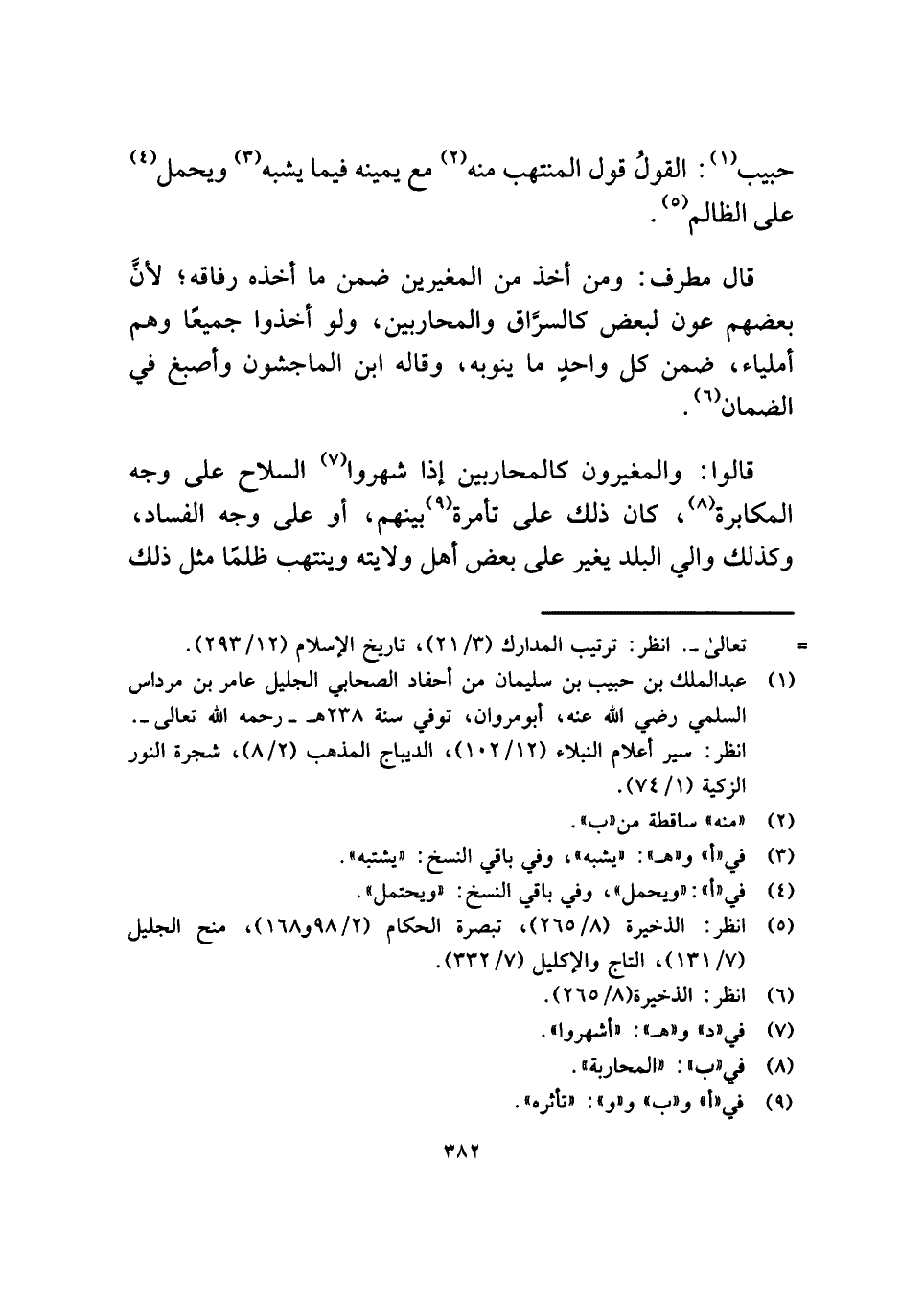قالوا: والمغيرون كالمحاربين إذا شهروا (¬٧) السلاح على وجه المكابرة (¬٨)، كان ذلك على تأمرة (¬٩) بينهم، أو على وجه الفساد، وكذلك والي البلد يغير على بعض أهل ولايته وينتهب ظلمًا مثل ذلك