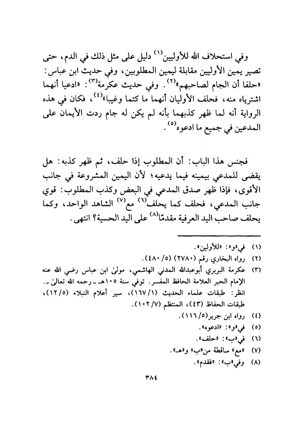 وفي استحلاف الله للأوليين (¬١) دليل على مثل ذلك في الدم، حتى تصير يمين الأوليين مقابلة ليمين المطلوبين، وفي حديث ابن عباس: "حلفا أن الجام لصاحبهم" (¬٢). وفي حديث عكرمة (¬٣): "ادعيا أنهما اشترياه منه، فحلف الأوليان أنهما ما كتما وغيبا" (¬٤)، فكان في هذه الرواية أنه لما ظهر كذبهما بأنه لم يكن له جام ردت الأيمان على المدعين في جميع ما ادعوه (¬٥).