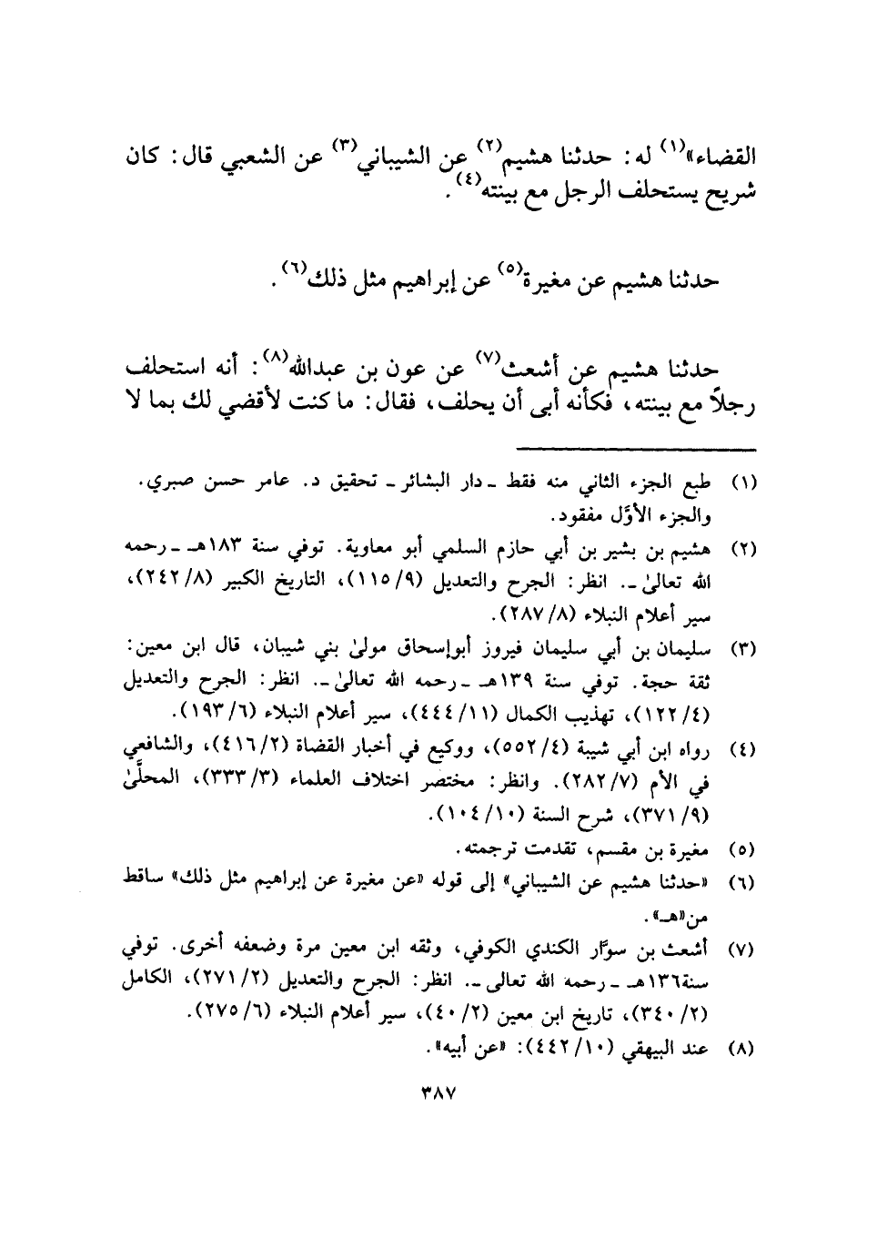 القضاء" (¬١) له: حدثنا هشيم (¬٢) عن الشيباني (¬٣) عن الشعبي قال: كان شريح يستحلف الرجل مع بينته (¬٤).