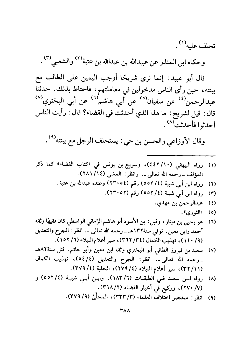قال أبو عبيد: إنما نرى شريحًا أوجب اليمين على الطالب مع بينته، حين رأى الناس مدخولين في معاملتهم، فاحتاط بذلك. حدثنا عبد الرحمن (¬٤) عن سفيان (¬٥) عن أبي هاشم (¬٦) عن أبي البختري (¬٧) قال: قيل لشريح: ما هذا الذي أحدثت في القضاء؟ قال: رأيت الناس أحدثوا فأحدثت (¬٨).