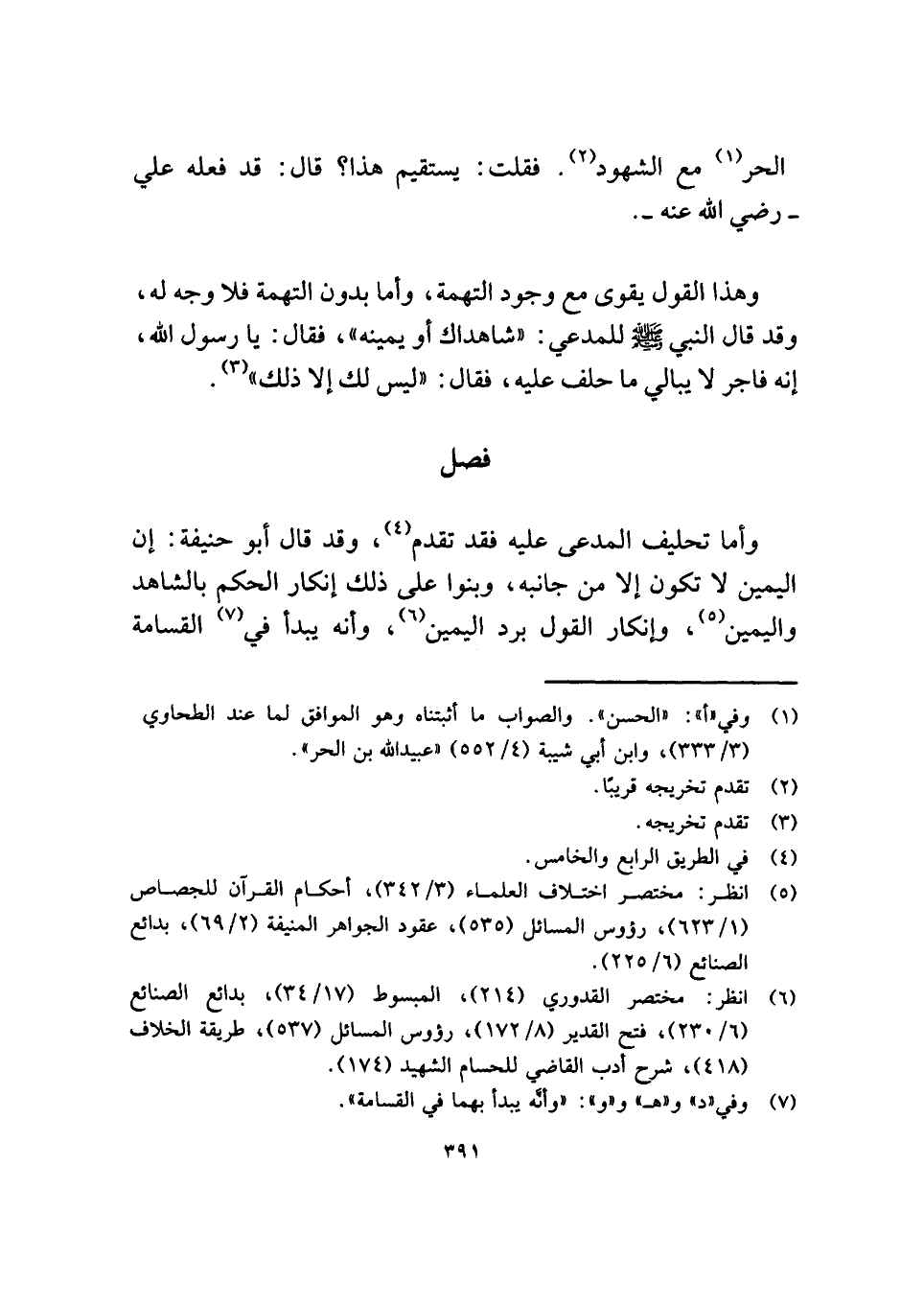 الحر (¬١) مع الشهود (¬٢). فقلت: يستقيم هذا؟ قال: قد فعله علي - رضي الله عنه -.