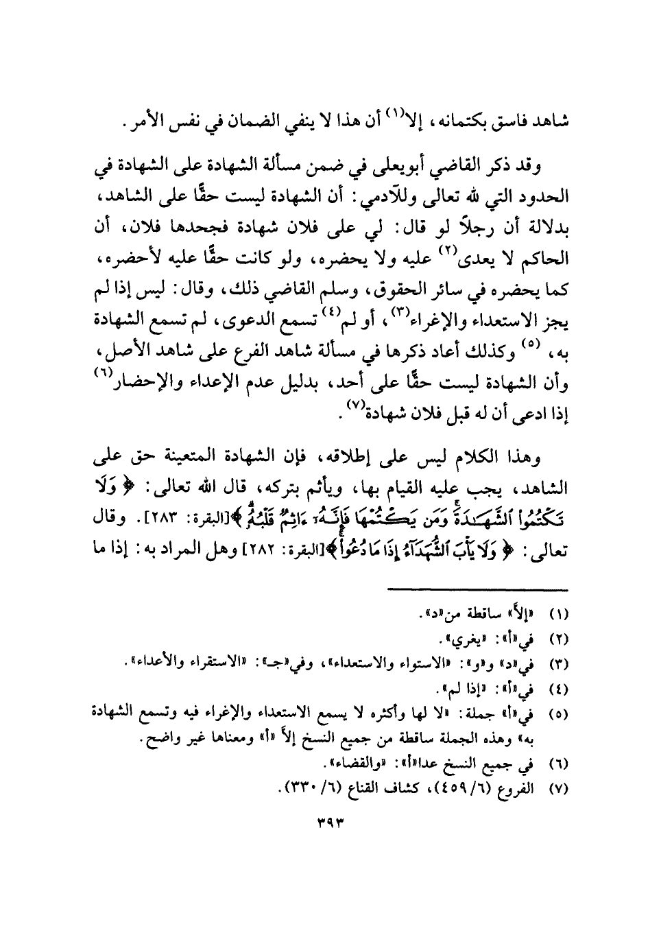 وهذا الكلام ليس على إطلاقه، فإن الشهادة المتعينة حق على الشاهد، يجب عليه القيام بها، ويأثم بتركه، قال الله تعالى: {وَلَا تَكْتُمُوا الشَّهَادَةَ} [البقرة: ٢٨٣]. وقال تعالى: {وَلَا يَأْبَ الشُّهَدَاءُ إِذَا مَا دُعُوا} [البقرة: ٢٨٢] وهل المراد به: إذا ما