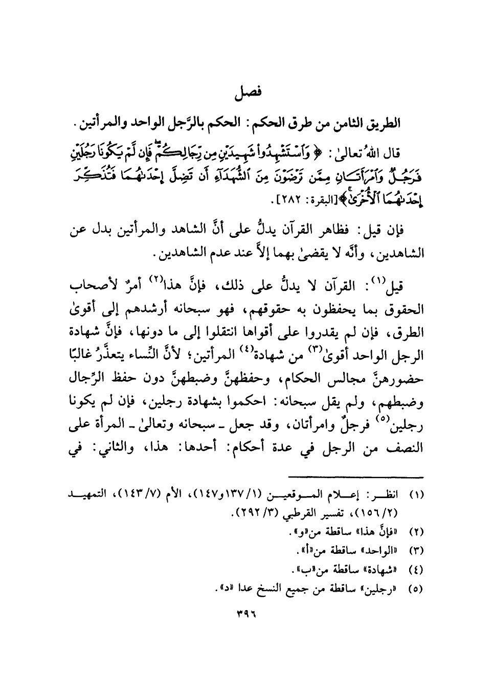 قيل (¬١): القرآن لا يدلُّ على ذلك، فإنَّ هذا (¬٢) أمرٌ لأصحاب الحقوق بما يحفظون به حقوقهم، فهو سبحانه أرشدهم إلى أقوى الطرق، فإن لم يقدروا على أقواها انتقلوا إلى ما دونها، فإنَّ شهادة الرجل الواحد أقوى (¬٣) من شهادة (¬٤) المرأتين؛ لأنَّ النَّساء يتعذَّرُ غالبًا حضورهنَّ مجالس الحكام، وحفظهنَّ وضبطهنَّ دون حفظ الرَّجال وضبطهم، ولم يقل سبحانه: احكموا بشهادة رجلين، فإن لم يكونا رجلين (¬٥) فرجلٌ وامرأتان، وقد جعل - سبحانه وتعالى - المرأة على النصف من الرجل في عدة أحكام: أحدها: هذا، والثاني: في