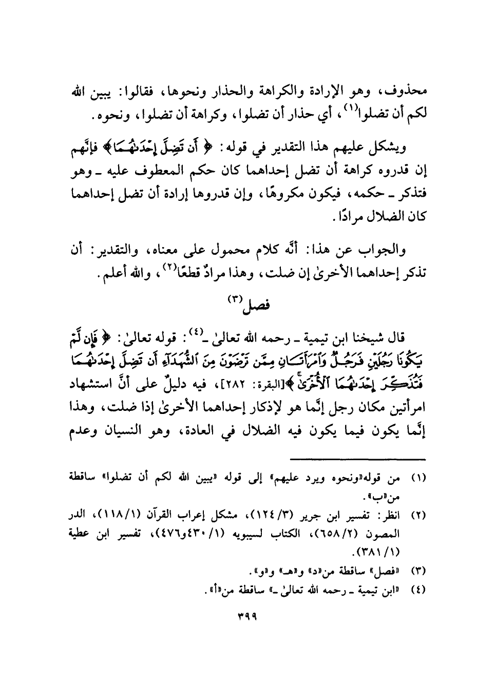 ويشكل عليهم هذا التقدير في قوله: {أَنْ تَضِلَّ إِحْدَاهُمَا} فإنَّهم إن قدروه كراهة أن تضل إحداهما كان حكم المعطوف عليه - وهو فتذكر - حكمه، فيكون مكروهًا، وإن قدروها إرادة أن تضل إحداهما كان الضلال مرادًا.