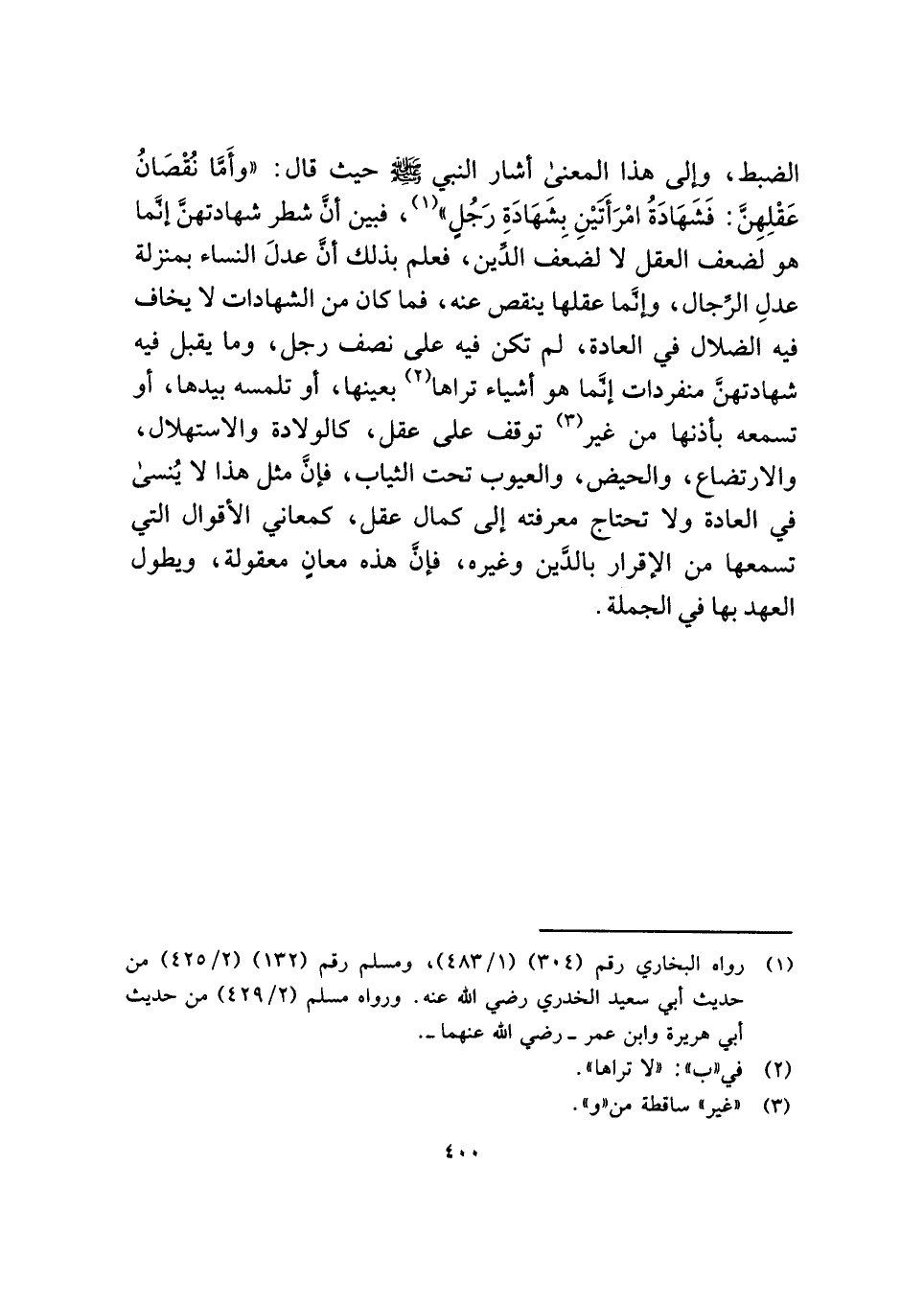 الضبط، وإلى هذا المعنى أشار النبي - صلى الله عليه وسلم - حيث قال: "وأَمَّا نُقْصَانُ عَقْلِهِنَّ: فَشَهَادَةُ امْرَأَتَيْنِ بشَهَادَةِ رَجُلٍ" (¬١)، فبين أنَّ شطر شهادتهنَّ إنَّما هو لضعف العقل لا لضعف الدِّين، فعلم بذلك أنَّ عدلَ النساء بمنزلة عدلِ الرِّجال، وإنَّما عقلها ينقص عنه، فما كان من الشهادات لا يخاف فيه الضلال في العادة، لم تكن فيه على نصف رجل، وما يقبل فيه شهادتهنَّ منفردات إنَّما هو أشياء تراها (¬٢) بعينها، أو تلمسه بيدها، أو تسمعه بأذنها من غير (¬٣) توقف على عقل، كالولادة والاستهلال، والارتضاع، والحيض، والعيوب تحت الثياب، فإنَّ مثل هذا لا يُنسى في العادة ولا تحتاج معرفته إلى كمال عقل، كمعاني الأقوال التي تسمعها من الإقرار بالدِّين وغيره، فإنَّ هذه معانٍ معقولة، ويطول العهد بها في الجملة.