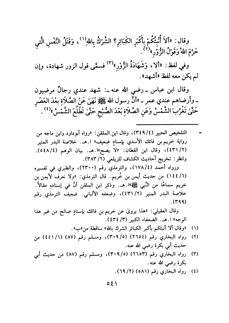 (¬١) "وقال ألا أنبئكم بأكبر الكبائر الشرك بالله" ساقطة من "ب".
