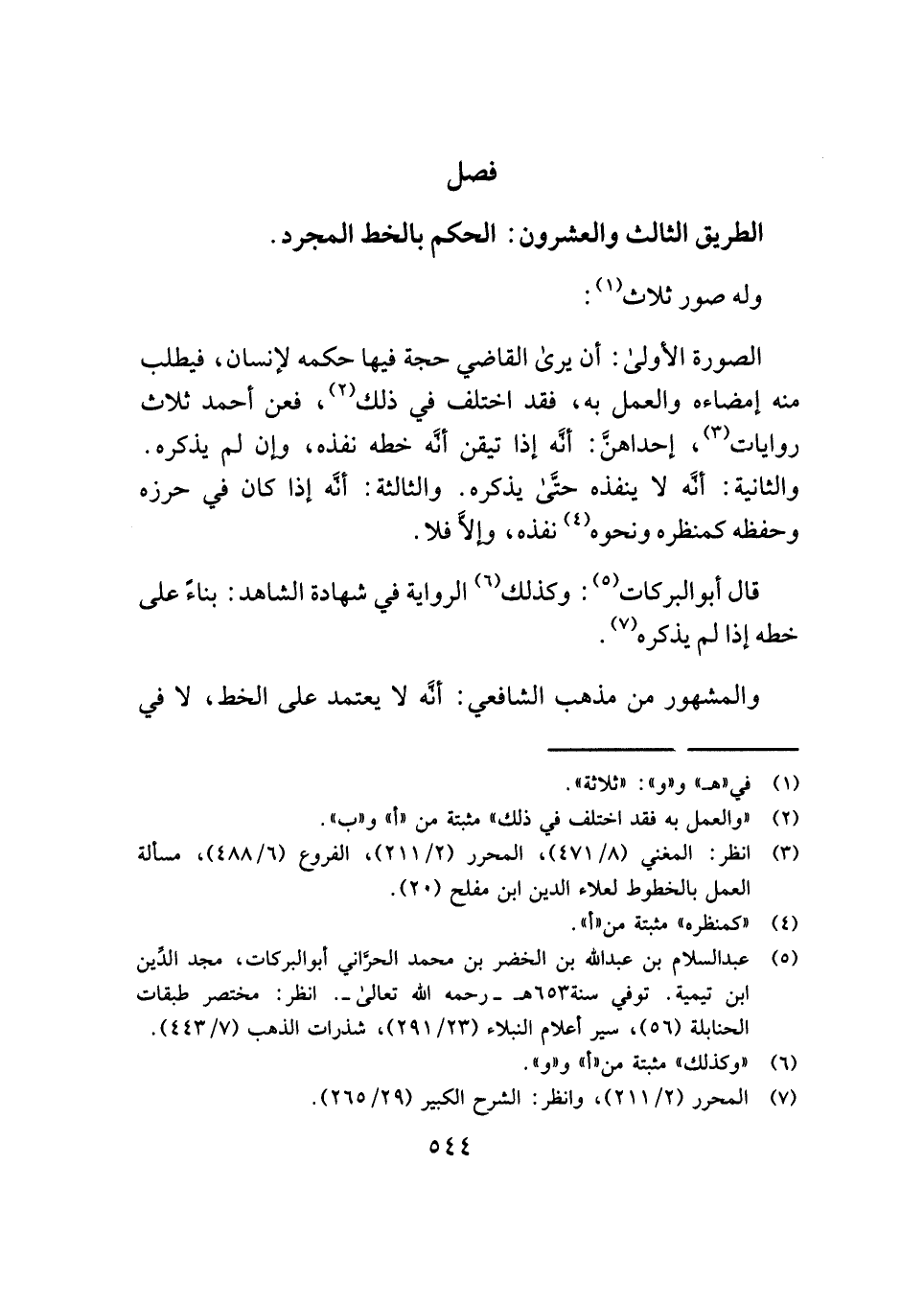(¬٣) انظر: المغني (٨/ ٤٧١)، المحرر (٢/ ٢١١)، الفروع (٦/ ٤٨٨)، مسألة العمل بالخطوط لعلاء الدين ابن مفلح (٢٠).