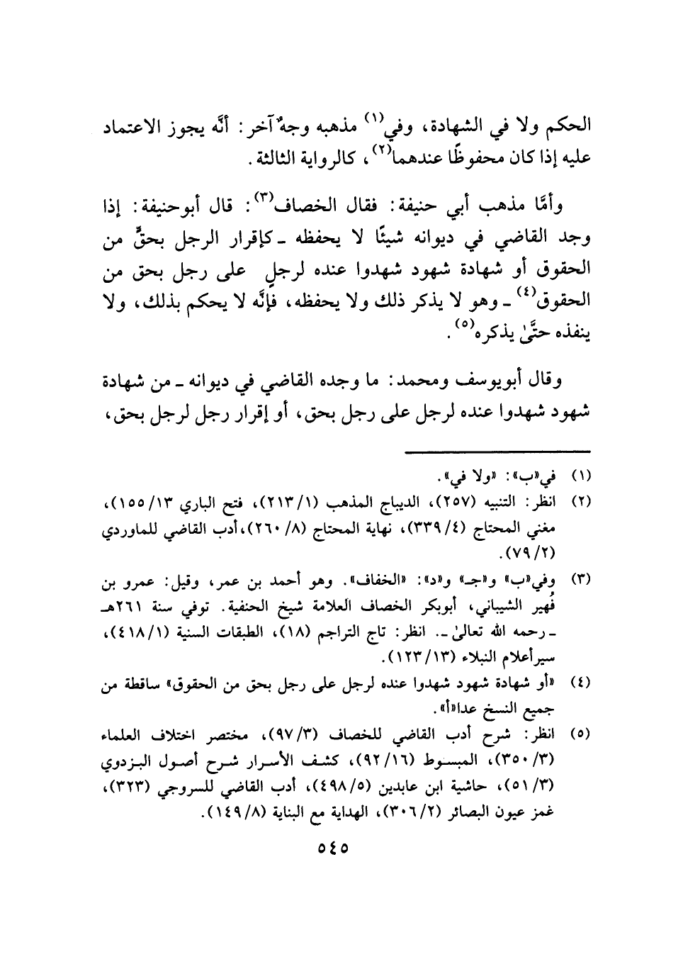 (¬٥) انظر: شرح أدب القاضي للخصاف (٣/ ٩٧)، مختصر اختلاف العلماء (٣/ ٣٥٠)، المبسوط (١٦/ ٩٢)، كشف الأسرار شرح أصول البزدوي (٣/ ٥١)، حاشية ابن عابدين (٥/ ٤٩٨)، أدب القاضي للسروجي (٣٢٣)، غمز عيون البصائر (٢/ ٣٠٦)، الهداية مع البناية (٨/ ١٤٩).