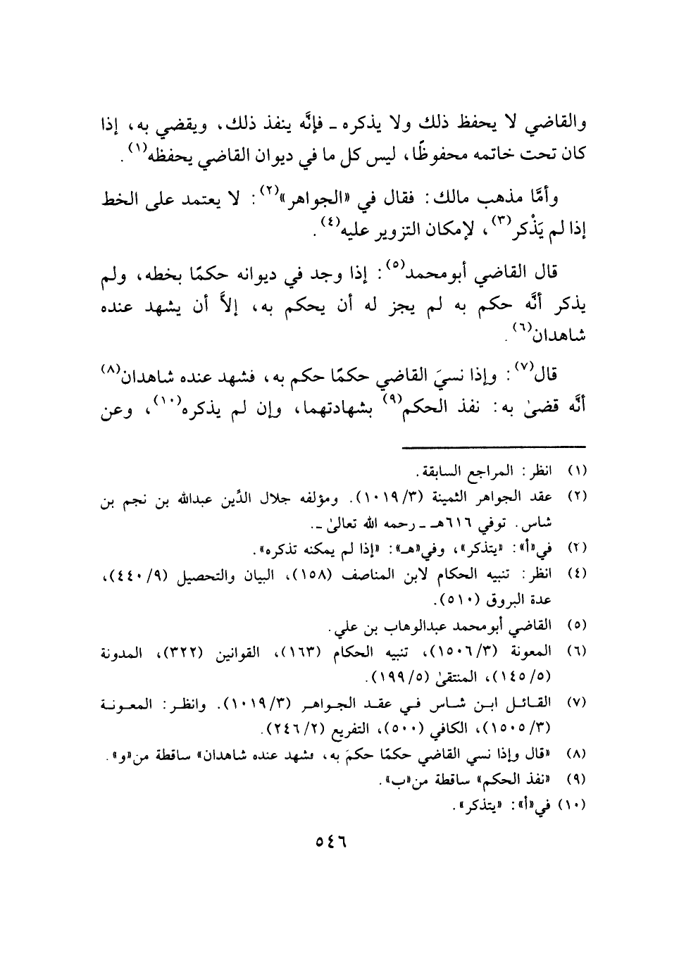 (¬٤) انظر: تنبيه الحكام لابن المناصف (١٥٨)، البيان والتحصيل (٩/ ٤٤٠)، عدة البروق (٥١٠).