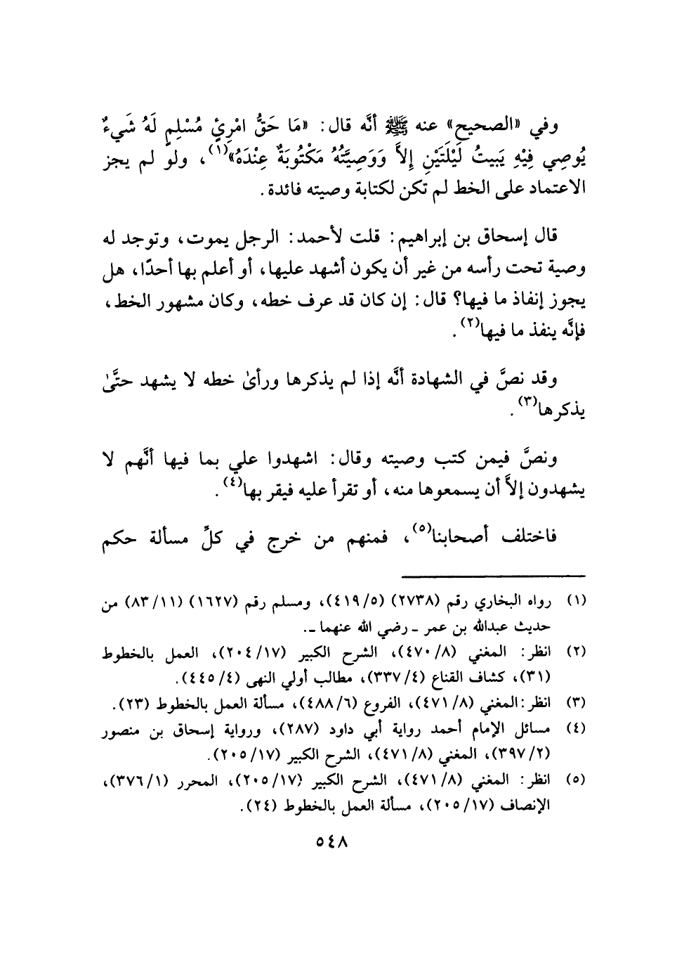 (¬٥) انظر: المغني (٨/ ٤٧١)، الشرح الكبير (١٧/ ٢٠٥)، المحرر (١/ ٣٧٦)، الإنصاف (١٧/ ٢٠٥)، مسألة العمل بالخطوط (٢٤).