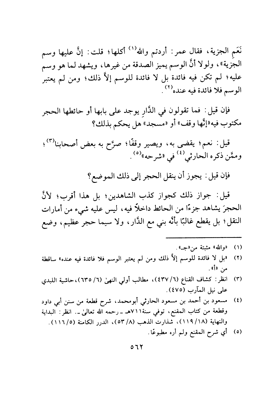 نَعَمِ الجزية، فقال عمر: أردتم والله (¬١) أكلها؛ قلت: إنَّ عليها وسم الجزية"، ولولا أنَّ الوسم يميز الصدقة من غيرها، ويشهد لما هو وسم عليه؛ لم تكن فيه فائدة بل لا فائدة للوسم إلَّا ذلك؛ ومن لم يعتبر الوسم فلا فائدة فيه عنده (¬٢).