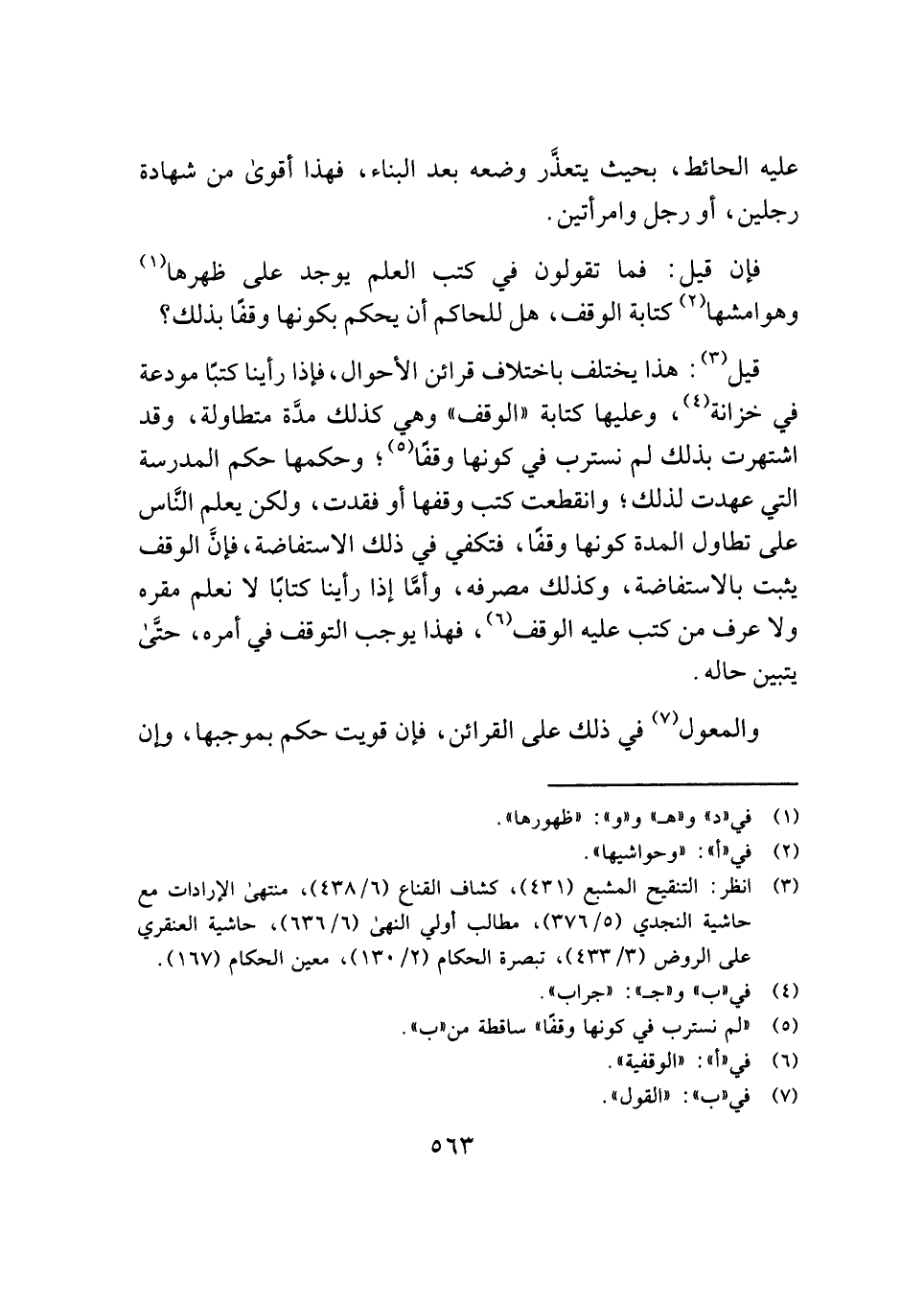 (¬٣) انظر: التنقيح المشبع (٤٣١)، كشاف القناع (٦/ ٤٣٨)، منتهى الإرادات مع حاشية النجدي (٥/ ٣٧٦)، مطالب أولي النهى (٦/ ٦٣٦)، حاشية العنقري على الروض (٣/ ٤٣٣)، تبصرة الحكام (٢/ ١٣٠)، معين الحكام (١٦٧).