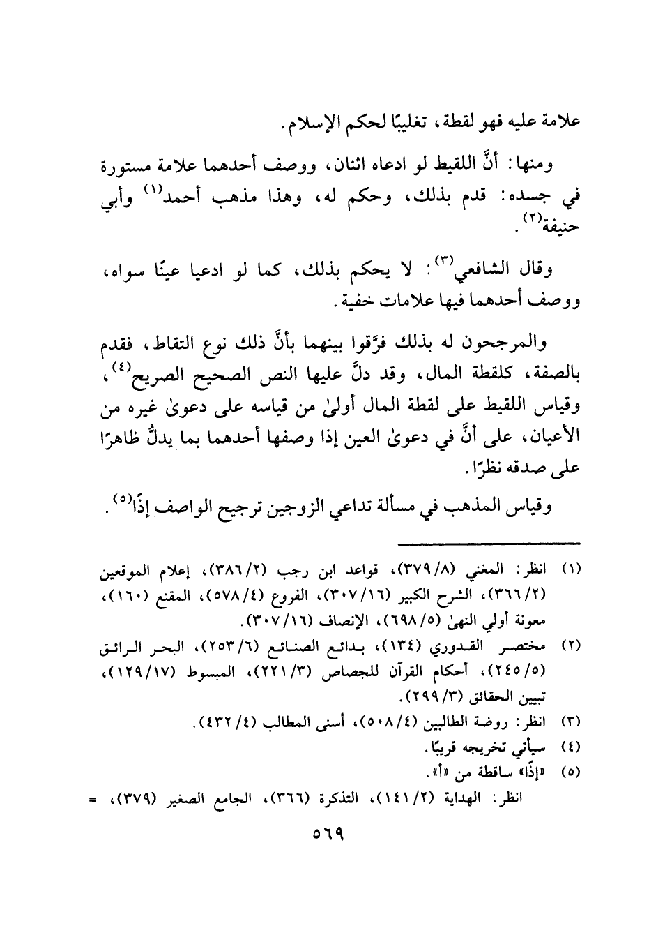 والمرجحون له بذلك فرَّقوا بينهما بأنَّ ذلك نوع التقاط، فقدم بالصفة، كلقطة المال، وقد دلَّ عليها النص الصحيح الصريح (¬٤)، وقياس اللقيط على لقطة المال أولى من قياسه على دعوى غيره من الأعيان، على أنَّ في دعوى العين إذا وصفها أحدهما بما يدلُّ ظاهرًا على صدقه نظرًا.