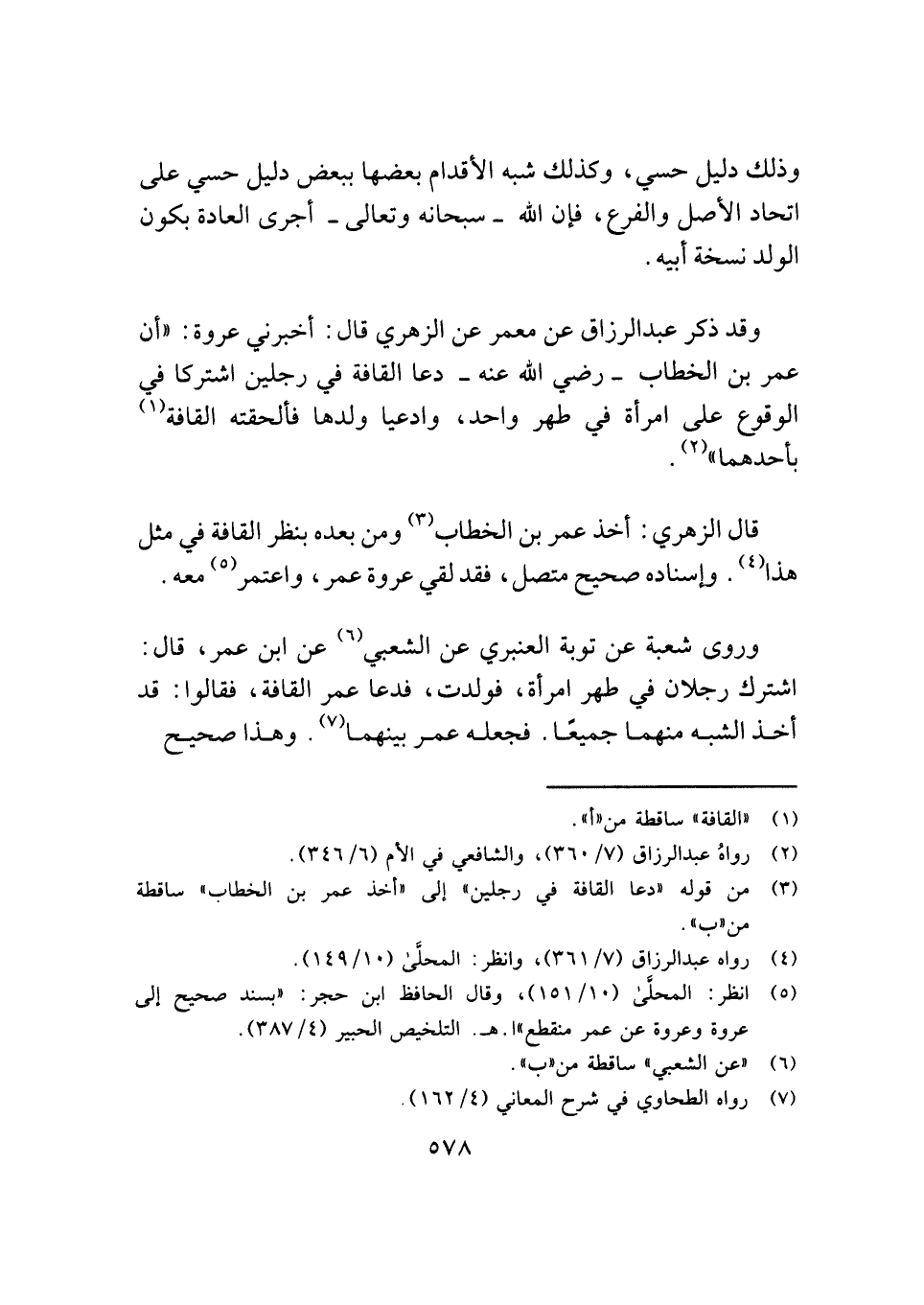 قال الزهري: أخذ عمر بن الخطاب (¬٣) ومن بعده بنظر القافة في مثل هذا (¬٤). وإسناده صحيح متصل، فقد لقي عروة عمر، واعتمر (¬٥) معه.