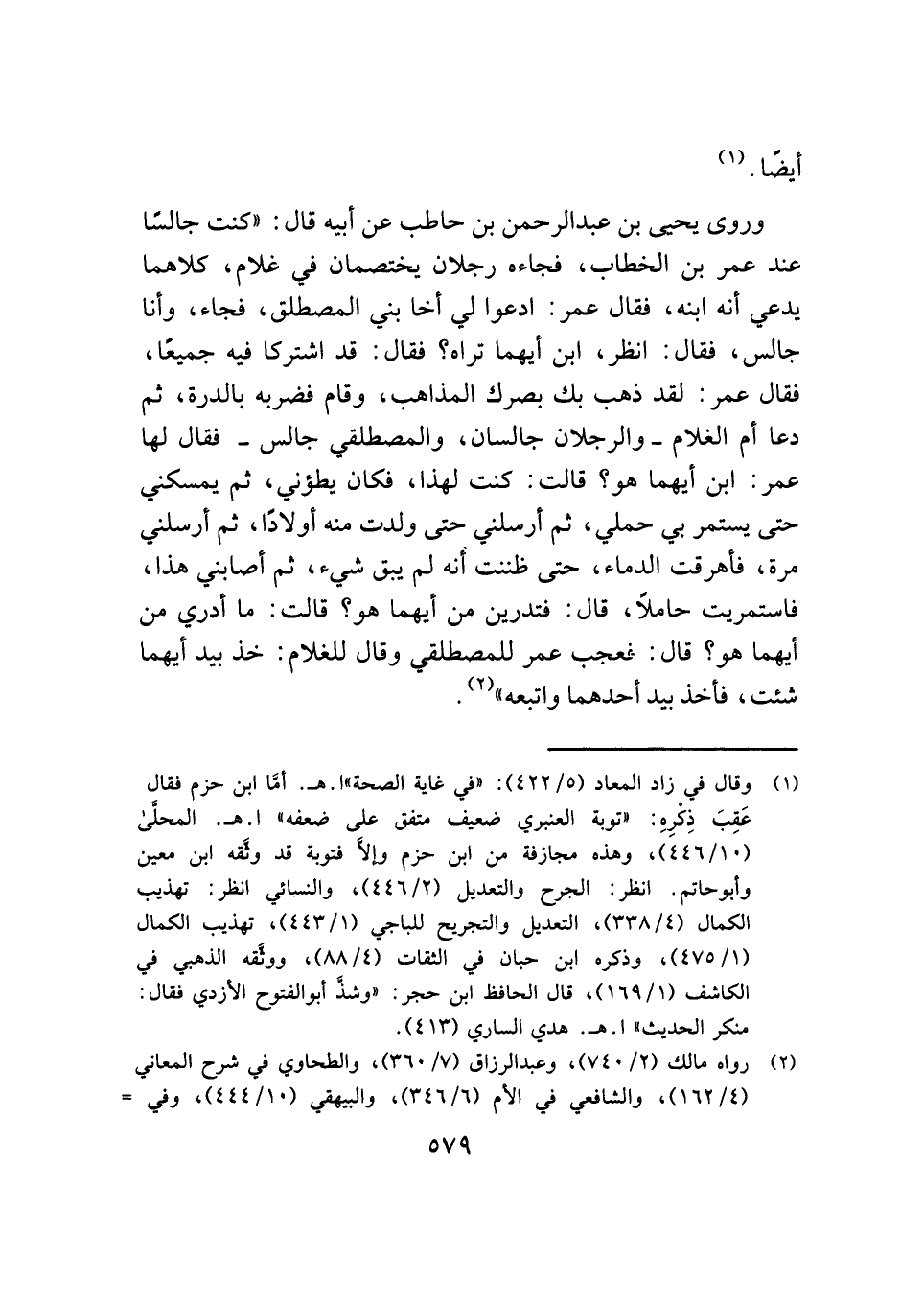 وروى يحيى بن عبد الرحمن بن حاطب عن أبيه قال: "كنت جالسًا عند عمر بن الخطاب، فجاءه رجلان يختصمان في غلام، كلاهما يدعي أنه ابنه، فقال عمر: ادعوا لي أخا بني المصطلق، فجاء، وأنا جالس، فقال: انظر، ابن أيهما تراه؟ فقال: قد اشتركا فيه جميعًا، فقال عمر: لقد ذهب بك بصرك المذاهب، وقام فضربه بالدرة، ثم دعا أم الغلام - والرجلان جالسان، والمصطلقي جالس - فقال لها عمر: ابن أيهما هو؟ قالت: كنت لهذا، فكان يطؤني، ثم يمسكني حتى يستمر بي حملي، ثم أرسلني حتى ولدت منه أولادًا، ثم أرسلني مرة، فأهرقت الدماء، حتى ظننت أنه لم يبق شيء، ثم أصابني هذا، فاستمريت حاملًا، قال: فتدرين من أيهما هو؟ قالت: ما أدري من أيهما هو؟ قال: فعجب عمر للمصطلقي وقال للغلام: خذ بيد أيهما شئت، فأخذ بيد أحدهما واتبعه" (¬٢).