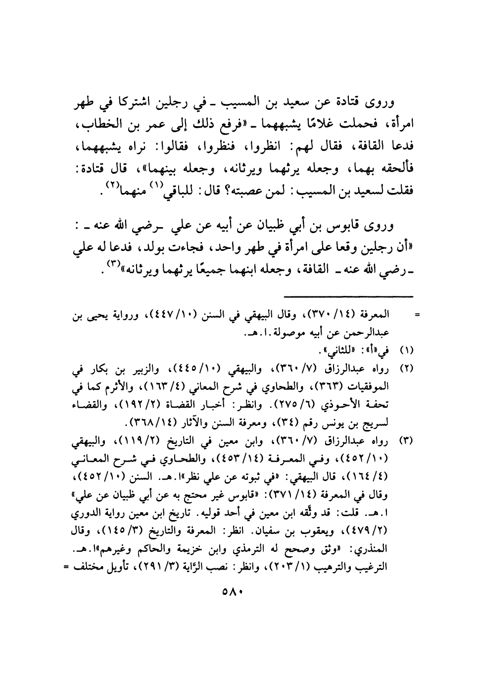 وروى قابوس بن أبي ظبيان عن أبيه عن علي - رضي الله عنه -: "أن رجلين وقعا على امرأة في طهر واحد، فجاءت بولد، فدعا له علي - رضي الله عنه - القافة، وجعله ابنهما جميعًا يرثهما ويرثانه" (¬٣).