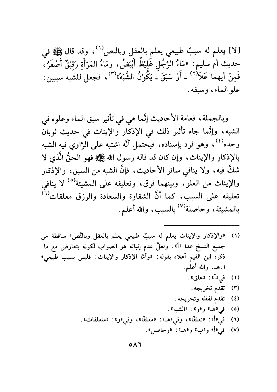 (¬١) "والإذكار والإيناث يعلم له سببٌ طبيعي يعلم بالعقل وبالنَّص" ساقطة من جميع النسخ عدا "أ". ولعلَّ عدم إثباته هو الصواب لكونه يتعارض مع ما ذكره ابن القيم أعلاه بقوله: "وأمَّا الإذكار والايناث: فليس بسبب طبيعي" ا. هـ. والله أعلم.