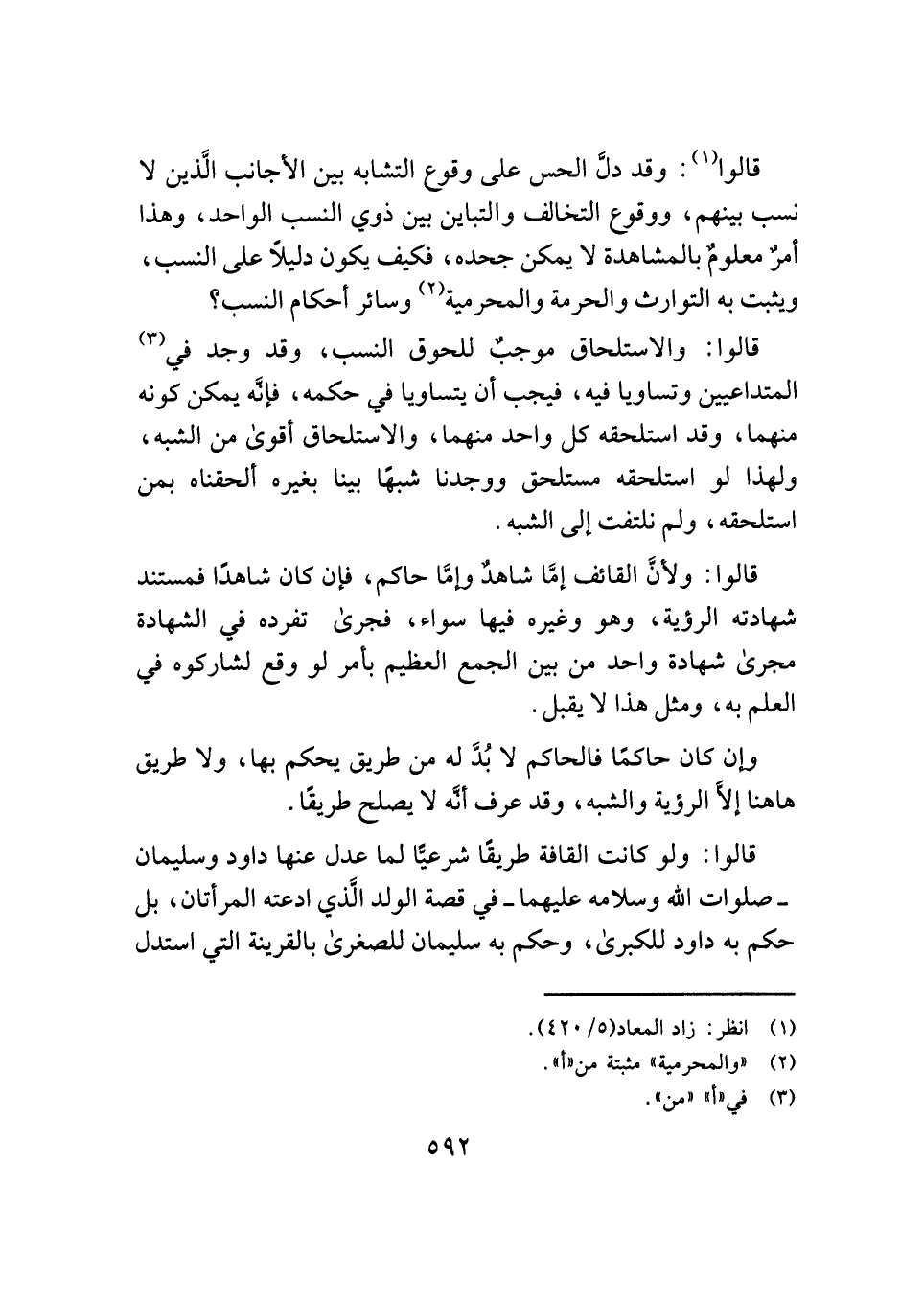 قالوا (¬١): وقد دلَّ الحس على وقوع التشابه بين الأجانب الَّذين لا نسب بينهم، ووقوع التخالف والتباين بين ذوي النسب الواحد، وهذا أمرٌ معلومٌ بالمشاهدة لا يمكن جحده، فكيف يكون دليلًا على النسب، ويثبت به التوارث والحرمة والمحرمية (¬٢) وسائر أحكام النسب؟