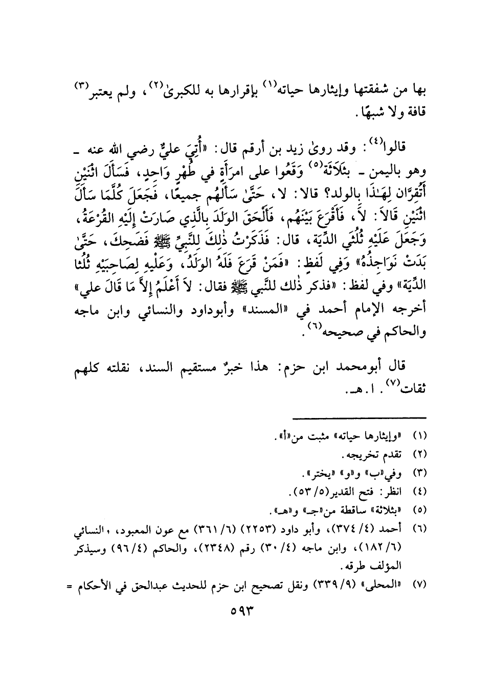 قال أبو محمد ابن حزم: هذا خبرٌ مستقيم السند، نقلته كلهم ثقات (¬٧). ا. هـ.