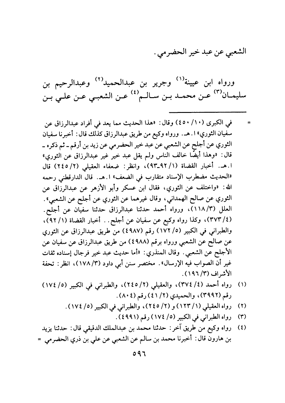 = في الكبرى (١٠/ ٤٥٠) وقال: "هذا الحديث مما يعد في أفراد عبد الرزاق عن سفيان الثوري" ا. هـ. ورواه وكيع من طريق عبد الرزاق كذلك قال: أخبرنا سفيان الثوري عن أجلح عن الشعبي عن عبد خير الحضرمي عن زيد بن أرقم - ثم ذكره - قال: "وهذا أيضًا خالف الناس ولم يقل عبد خير غير عبد الرزاق عن الثوري" ا. هـ. أخبار القضاة (١/ ٩٢ - ٩٣)، وانظر: ضعفاء العقيلي (٢/ ٢٤٥) قال "الحديث مضطرب الإسناد متقارب في الضعف" ا. هـ. قال الدارقطني رحمه الله: "واختلف عن الثوري، فقال ابن عسكر وأبو الأزهر عن عبد الرزاق عن الثوري عن صالح الهمداني، وقال غيرهما عن الثوري عن أجلح عن الشعبي". العلل (٣/ ١١٨)، ورواه أحمد حدثنا عبد الرزاق حدثنا سفيان عن أجلح. (٤/ ٣٧٣)، وكذا رواه وكيع عن سفيان عن أجلح .. أخبار القضاة (١/ ٩٢)، والطبراني في الكبير (٥/ ١٧٢) رقم (٤٩٨٧) من طريق عبد الرزاق عن الثوري عن صالح عن الشعبي ورواه برقم (٤٩٨٨) من طريق عبد الرزاق عن سفيان عن الأجلح عن الشعبي. وقال المنذري: "أما حديث عبد خير فرجال إسناده ثقات غير أن الصواب فيه الإرسال". مختصر سنن أبي داود (٣/ ١٧٨)، انظر: تحفة الأشراف (٣/ ١٩٦).