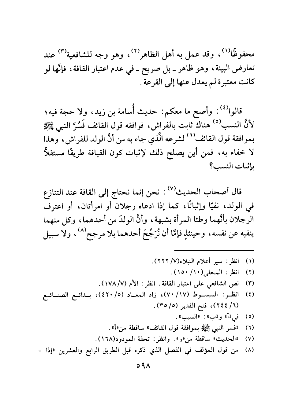 قال أصحاب الحديث (¬٧): نحن إنما نحتاج إلى القافة عند التنازع في الولد، نفيًا وإثباتًا، كما إذا ادعاه رجلان أو امرأتان، أو اعترف الرجلان بأنَّهما وطئا المرأة بشبهة، وأنَّ الولدَ من أحدهما، وكل منهما ينفيه عن نفسه، وحينئذٍ فإمَّا أن نُرَجِّحَ أحدهما بلا مرجح (¬٨)، ولا سبيل
