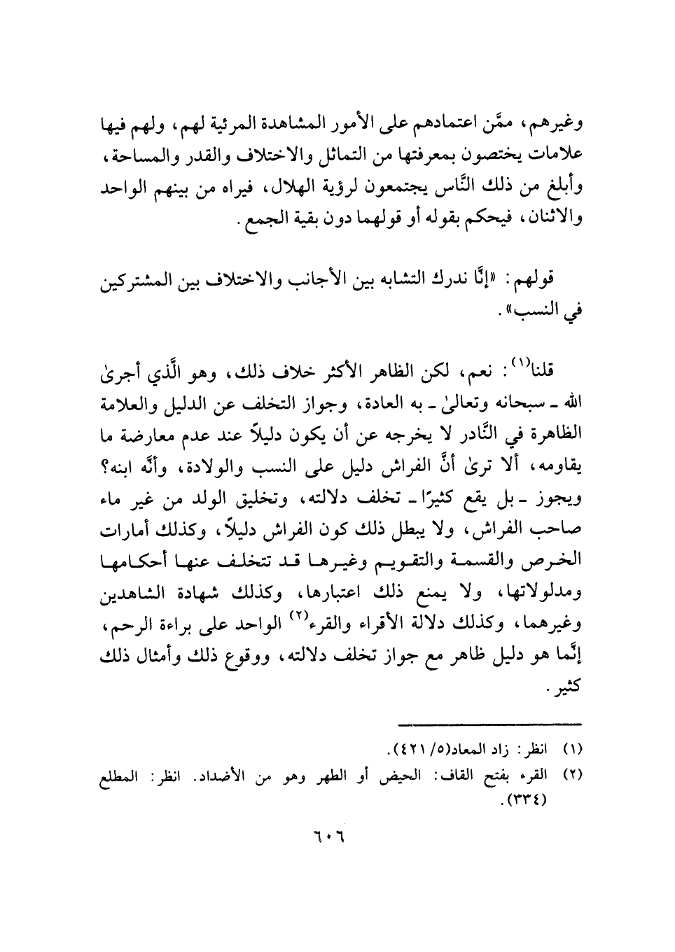 قلنا (¬١): نعم، لكن الظاهر الأكثر خلاف ذلك، وهو الَّذي أجرى الله - سبحانه وتعالى - به العادة، وجواز التخلف عن الدليل والعلامة الظاهرة في النَّادر لا يخرجه عن أن يكون دليلًا عند عدم معارضة ما يقاومه، ألا ترى أنَّ الفراش دليل على النسب والولادة، وأنَّه ابنه؟ ويجوز - بل يقع كثيرًا - تخلف دلالته، وتخليق الولد من غير ماء صاحب الفراش، ولا يبطل ذلك كون الفراش دليلًا، وكذلك أمارات الخرص والقسمة والتقويم وغيرها قد تتخلف عنها أحكامها ومدلولاتها، ولا يمنع ذلك اعتبارها، وكذلك شهادة الشاهدين وغيرهما، وكذلك دلالة الأقراء والقرء (¬٢) الواحد على براءة الرحم، إنَّما هو دليل ظاهر مع جواز تخلف دلالته، ووقوع ذلك وأمثال ذلك كثير.