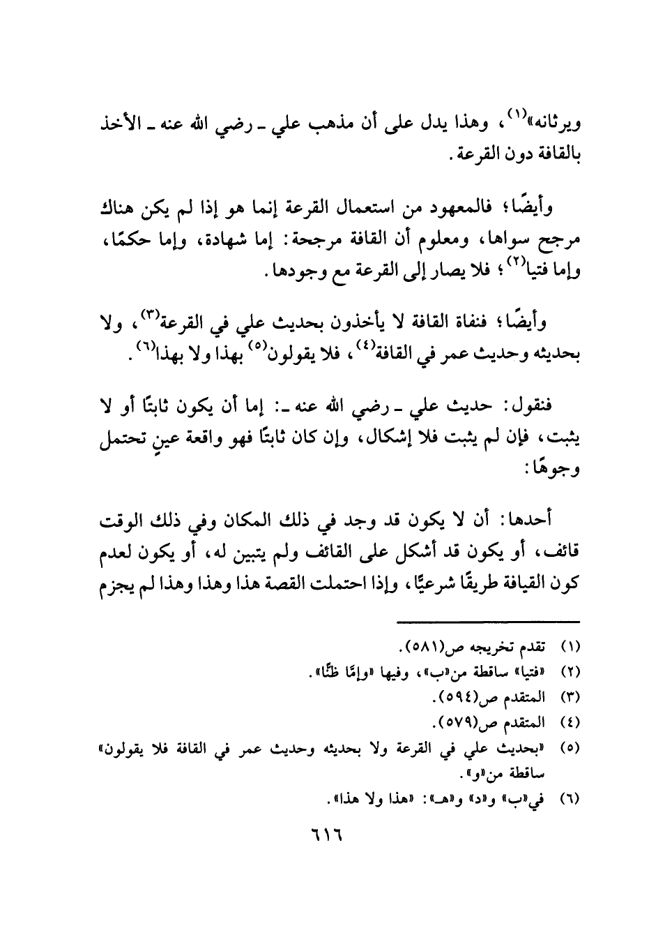 وأيضًا؛ فنفاة القافة لا يأخذون بحديث علي في القرعة (¬٣)، ولا بحديثه وحديث عمر في القافة (¬٤)، فلا يقولون (¬٥) بهذا ولا بهذا (¬٦).