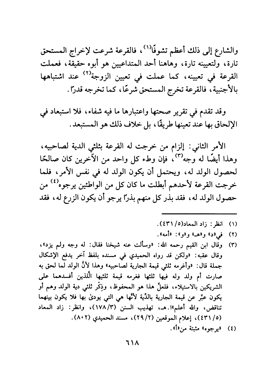 (¬٣) وقال ابن القيم رحمه الله: "وسألت عنه شيخنا فقال: له وجه ولم يزد"، وقال عقبه: "ولكن قد رواه الحميدي في مسنده بلفظ آخر يدفع الإشكال جملة قال: "وأغرمه ثلثي قيمة الجارية لصاحبيه" وهذا لأنَّ الولد لما لحق به صارت أم ولد وله فيها ثلثها فغرمه قيمة ثلثيها الَّلذين أفسدهما على الشريكين بالاستيلاء، فلعلَّ هذا هو المحفوظ، وذِكْر ثلثي دية الولد وهم أو يكون عبَّر عن قيمة الجارية بالدِّية لأنَّها هي التي يودى بها فلا يكون بينهما تناقض، والله أعلم" ا. هـ، تهذيب السنن (٣/ ١٧٨)، وانظر: زاد المعاد (٥/ ٤٣١)، إعلام الموقعين (٢/ ٢٩)، مسند الحميدي (٨٠٢).