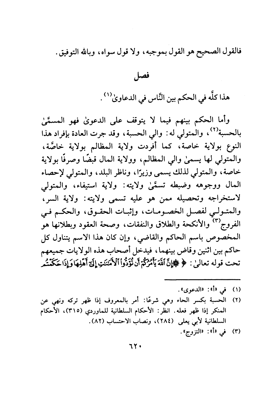 وأما الحكم بينهم فيما لا يتوقف على الدعوى فهو المسمَّى بالحسبة (¬٢)، والمتولي له: والي الحسبة، وقد جرت العادة بإفراد هذا النوع بولاية خاصة، كما أفردت ولاية المظالم بولاية خاصَّة، والمتولي لها يسمى والي المظالم، وولاية المال قبضًا وصرفًا بولاية خاصة، والمتولي لذلك يسمى وزيرًا، وناظر البلد، والمتولي لإحصاء المال ووجوهه وضبطه تسمَّى ولايته: ولاية استيفاء، والمتولي لاستخراجه وتحصيله ممن هو عليه تسمى ولايته: ولاية السر، والمتولي لفصل الخصومات، وإثبات الحقوق، والحكم في الفروج (¬٣) والأنكحة والطلاق والنفقات، وصحة العقود وبطلانها هو المخصوص باسم الحاكم والقاضي، وإن كان هذا الاسم يتناول كل حاكم بين اثنين وقاض بينهما، فيدخل أصحاب هذه الولايات جميعهم تحت قوله تعالى: {إِنَّ اللَّهَ يَأْمُرُكُمْ أَنْ تُؤَدُّوا الْأَمَانَاتِ إِلَى أَهْلِهَا وَإِذَا حَكَمْتُمْ