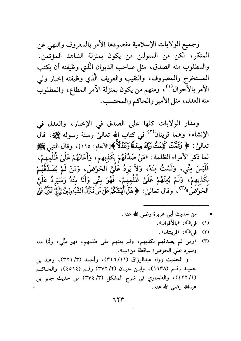ومدار الولايات كلها على الصدق في الإخبار، والعدل في الإنشاء، وهما قرينان (¬٢) في كتاب الله تعالى وسنة رسوله - صلى الله عليه وسلم -، قال تعالى: {وَتَمَّتْ كَلِمَتُ رَبِّكَ صِدْقًا وَعَدْلً} [الأنعام: ١١٥]، وقال النبي - صلى الله عليه وسلم - لما ذكر الأمراء الظلمة: "مَنْ صَدَّقَهُمْ بكَذِبِهم، وَأَعَانَهُمْ عَلَى ظُلْمِهِمْ، فَلَيْسَ مِنِّي، وَلَسْتُ مِنْهُ، وَلَا يَرِدُ عَلَيَّ الحَوْضَ، وَمَنْ لَمْ يُصَدِّقْهُمْ بِكَذِبِهِمْ، وَلَمْ يُعِنْهُمْ عَلَى ظُلْمِهِمْ، فَهُوَ مِنِّي وِأَنَا مِنْهُ وَسَيَردُ عَلَيَّ الحَوْضَ" (¬٣)، وقال تعالى: {هَلْ أُنَبِّئُكُمْ عَلَى مَنْ تَنَزَّلُ الشَّيَاطِينُ (٢٢١) تَنَزَّلُ عَلَى