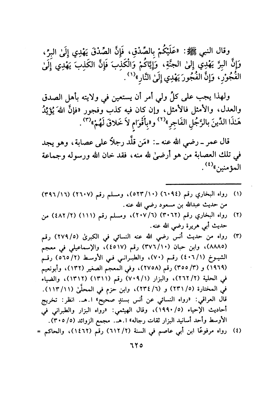 وقال النبي - صلى الله عليه وسلم -: "عَلَيْكُمْ بالصِّدْقِ، فَإِنَّ الصِّدْقَ يَهْدِي إِلَى البِرِّ، وَإِنَّ البِرَّ يَهْدِي إِلى الجنَّةِ، وَإِيَّاكُمْ وَالْكَذِبَ فَإِنَّ الكَذِبَ يَهْدِي إِلَى الفُجُوْرِ، وَإِنَّ الفُجُورَ يَهْدِي إِلَى النَّارِ" (¬١).