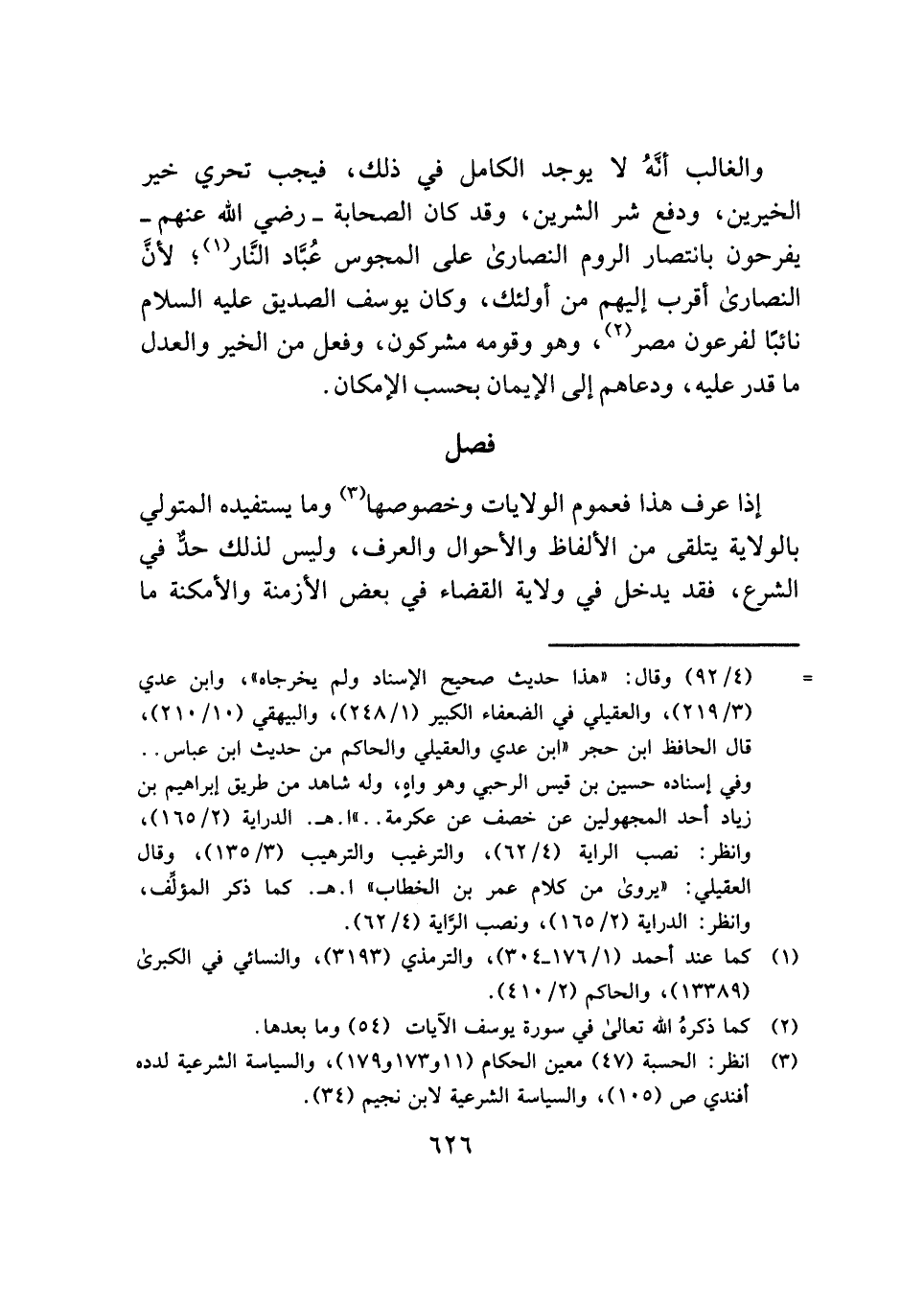 والغالب أنَّهُ لا يوجد الكامل في ذلك، فيجب تحري خير الخيرين، ودفع شر الشرين، وقد كان الصحابة - رضي الله عنهم - يفرحون بانتصار الروم النصارى على المجوس عُبَّاد النَّار (¬١)؛ لأنَّ النصارى أقرب إليهم من أولئك، وكان يوسف الصديق عليه السلام نائبًا لفرعون مصر (¬٢)، وهو وقومه مشركون، وفعل من الخير والعدل ما قدر عليه، ودعاهم إلى الإيمان بحسب الإمكان.