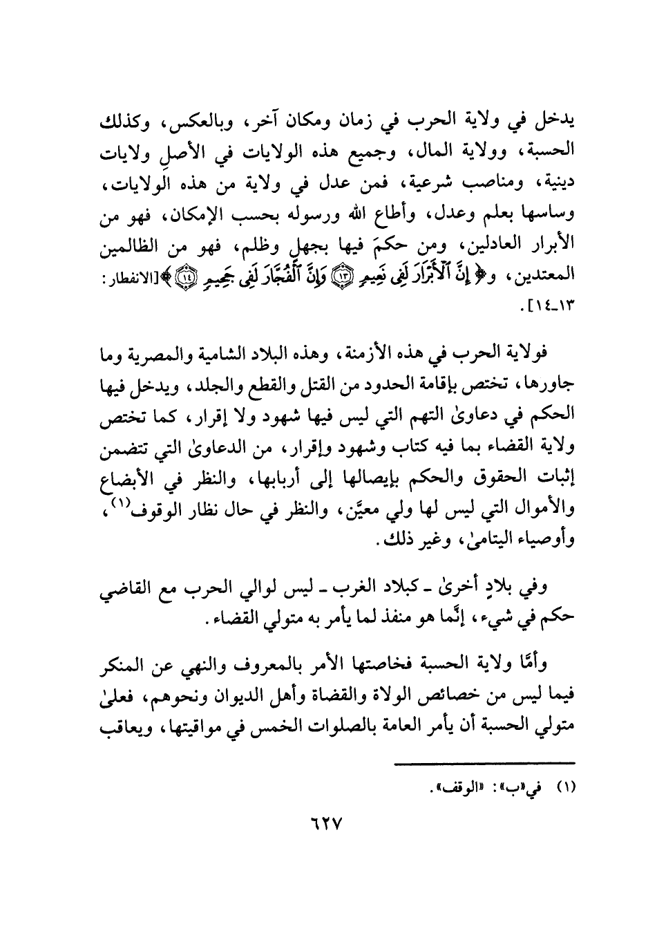 يدخل في ولاية الحرب في زمان ومكان آخر، وبالعكس، وكذلك الحسبة، وولاية المال، وجميع هذه الولايات في الأصلِ ولايات دينية، ومناصب شرعية، فمن عدل في ولاية من هذه الولايات، وساسها بعلم وعدل، وأطاع الله ورسوله بحسب الإمكان، فهو من الأبرار العادلين، ومن حكمَ فيها بجهلٍ وظلم، فهو من الظالمين المعتدين، و {إِنَّ الْأَبْرَارَ لَفِي نَعِيمٍ (١٣) وَإِنَّ الْفُجَّارَ لَفِي جَحِيمٍ (١٤)} [الانفطار: ١٣، ١٤].