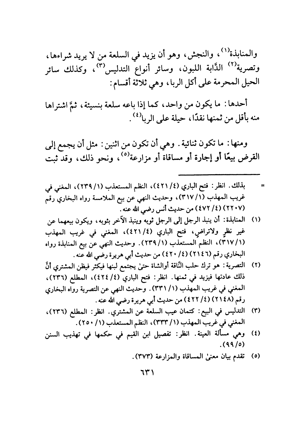 والمنابذة (¬١)، والنجش، وهو أن يزيد في السلعة من لا يريد شراءها، وتصرية (¬٢) الدَّابة اللبون، وسائر أنواع التدليس (¬٣)، وكذلك سائر الحيل المحرمة على أكل الربا، وهي ثلاثة أقسام: