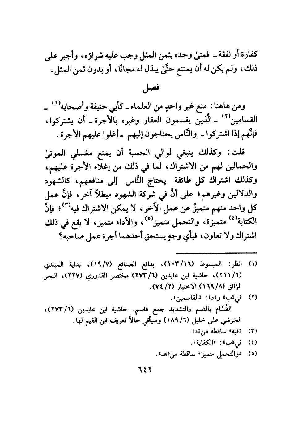 قلت: وكذلك ينبغي لوالي الحسبة أن يمنع مغسلي الموتى والحمالين لهم من الاشتراك، لما في ذلك من إغلاء الأجرة عليهم، وكذلك اشتراك كل طائفة يحتاج النَّاس إلى منافعهم، كالشهود والدلالين وغيرهم؛ على أنَّ في شركة الشهود مبطلًا آخر، فإنَّ عمل كل واحد منهم متميزٌ عن عمل الآخر، لا يمكن الاشتراك فيه (¬٣)؛ فإنَّ الكتابة (¬٤) متميزة، والتحمل متميز (¬٥)، والأداء متميز، لا يقع في ذلك اشتراك ولا تعاون، فبأي وجهٍ يستحق أحدهما أجرة عمل صاحبه؟