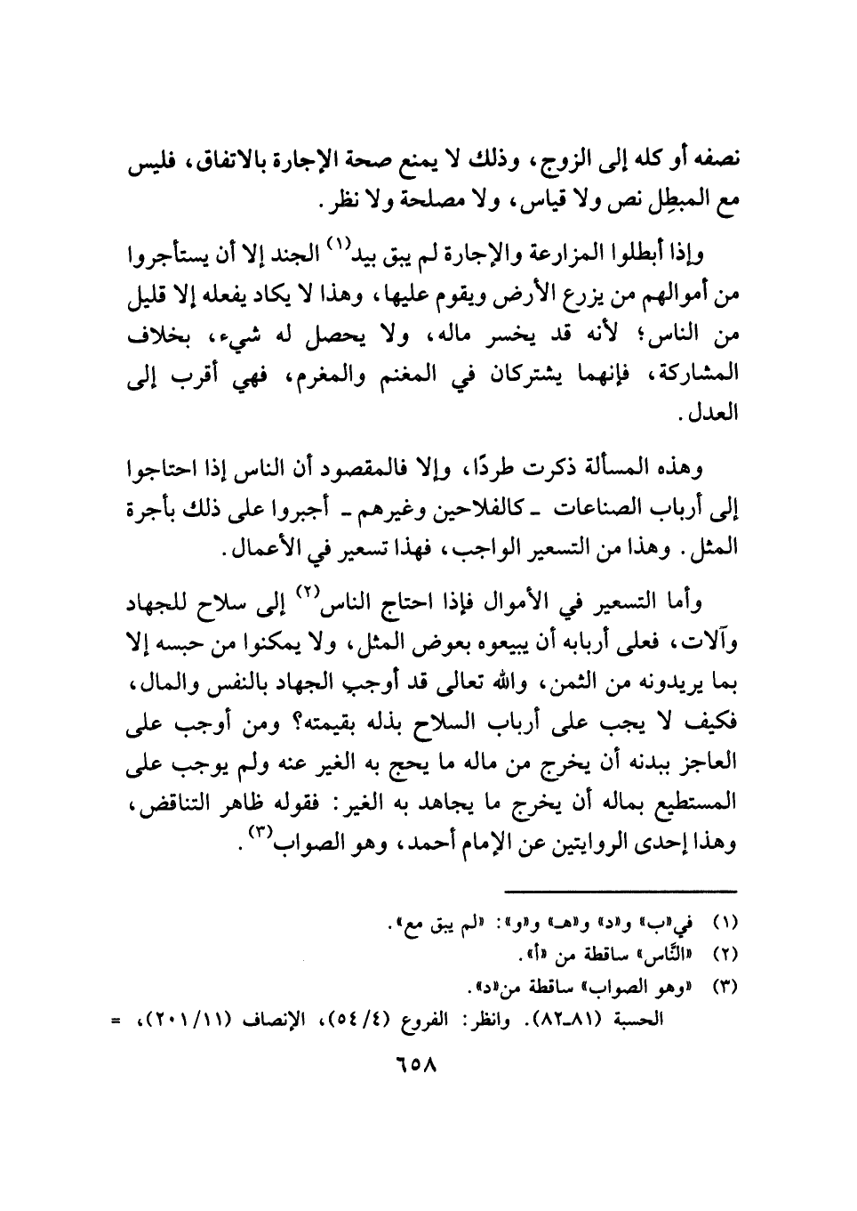 وأما التسعير في الأموال فإذا احتاج الناس (¬٢) إلى سلاح للجهاد وآلات، فعلى أربابه أن يبيعوه بعوض المثل، ولا يمكنوا من حبسه إلا بما يريدونه من الثمن، والله تعالى قد أوجب الجهاد بالنفس والمال، فكيف لا يجب على أرباب السلاح بذله بقيمته؟ ومن أوجب على العاجز ببدنه أن يخرج من ماله ما يحج به الغير عنه ولم يوجب على المستطيع بماله أن يخرج ما يجاهد به الغير: فقوله ظاهر التناقض، وهذا إحدى الروايتين عن الإمام أحمد، وهو الصواب (¬٣).