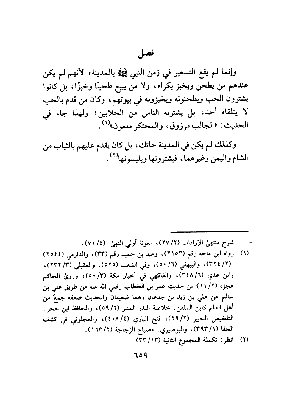 وإنما لم يقع التسعير في زمن النبي - صلى الله عليه وسلم - بالمدينة؛ لأنهم لم يكن عندهم من يطحن ويخبز بكراء، ولا من يبيع طحينًا وخبزًا، بل كانوا يشترون الحب ويطحنونه ويخبزونه في بيوتهم، وكان من قدم بالحب لا يتلقاه أحد، بل يشتريه الناس من الجلابين؛ ولهذا جاء في الحديث: "الجالب مرزوق، والمحتكر ملعون" (¬١).