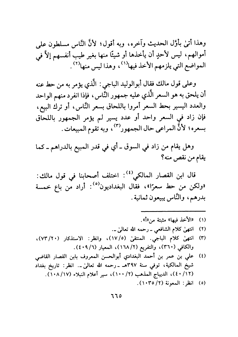 (¬٣) انتهى كلام الباجي. المنتقى (٥/ ١٧)، وانظر: الاستذكار (٢٠/ ٧٣)، والكافي (٣٦٠)، والتفريع (٢/ ١٦٨)، المعيار (٦/ ٤٠٩).