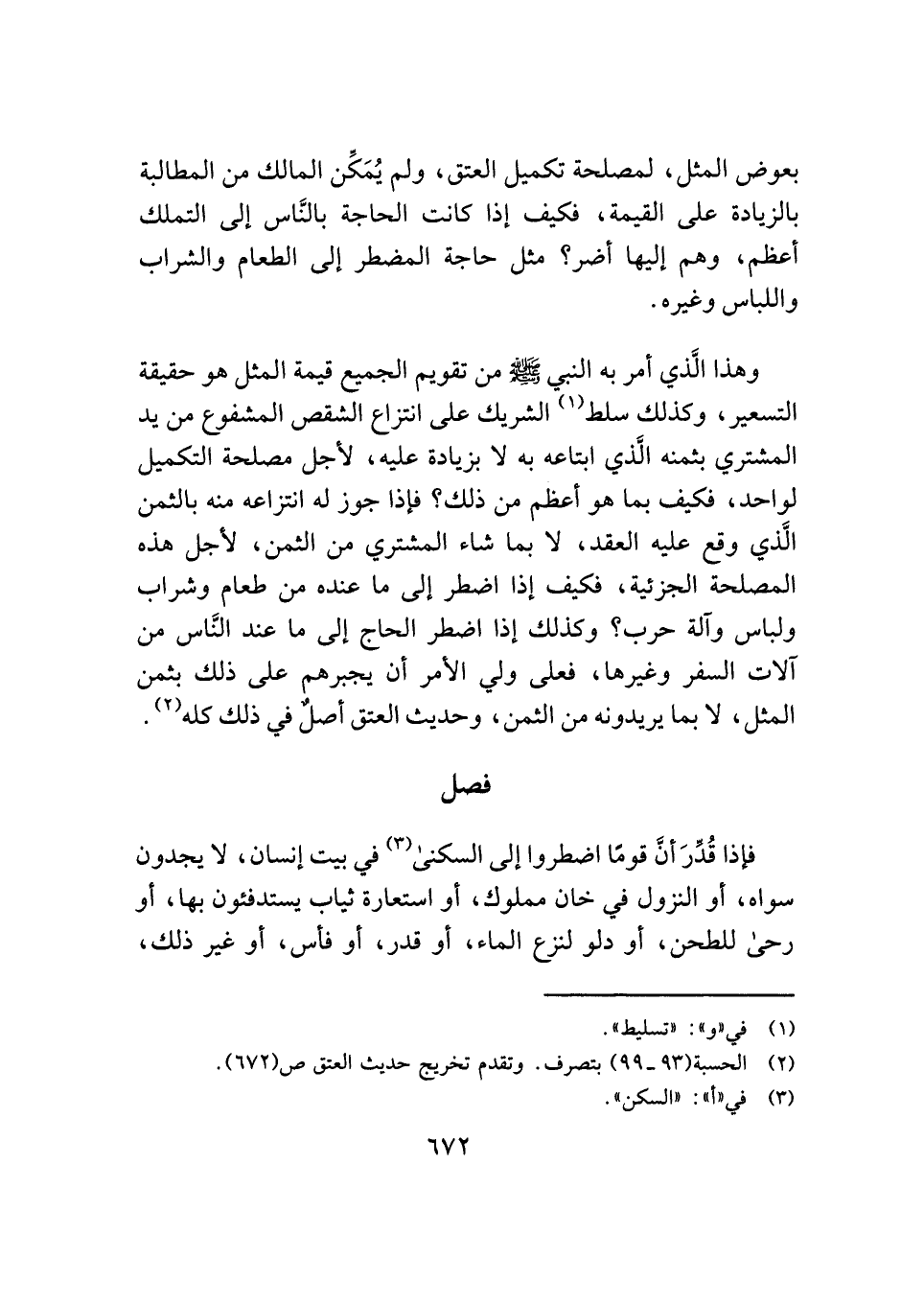 (¬٢) الحسبة (٩٣ - ٩٩) بتصرف. وتقدم تخريج حديث العتق ص (٦٧٢).