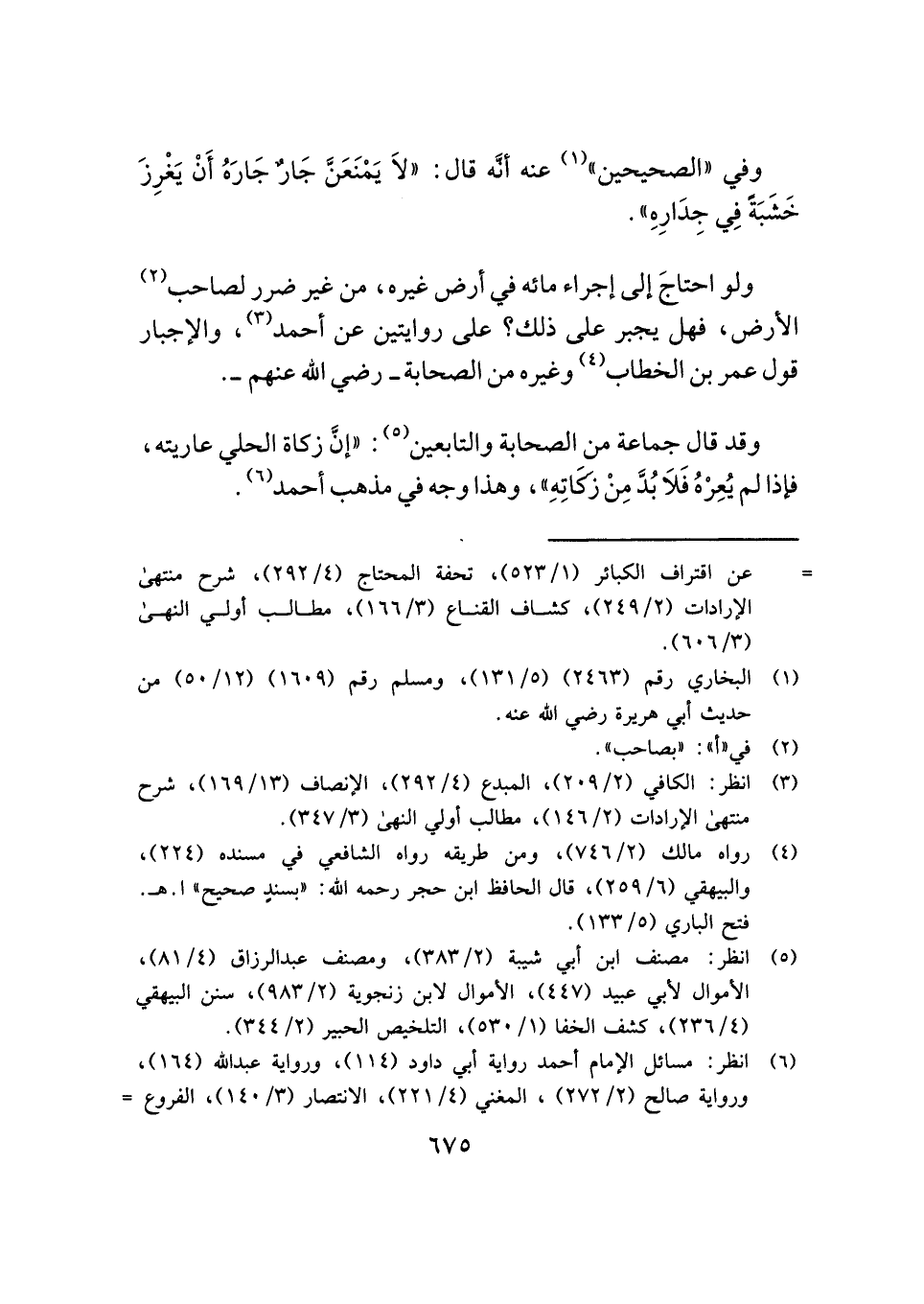 ولو احتاجَ إلى إجراء مائه في أرض غيره، من غير ضرر لصاحب (¬٢) الأرض، فهل يجبر على ذلك؟ على روايتين عن أحمد (¬٣)، والإجبار قول عمر بن الخطاب (¬٤) وغيره من الصحابة - رضي الله عنهم -.