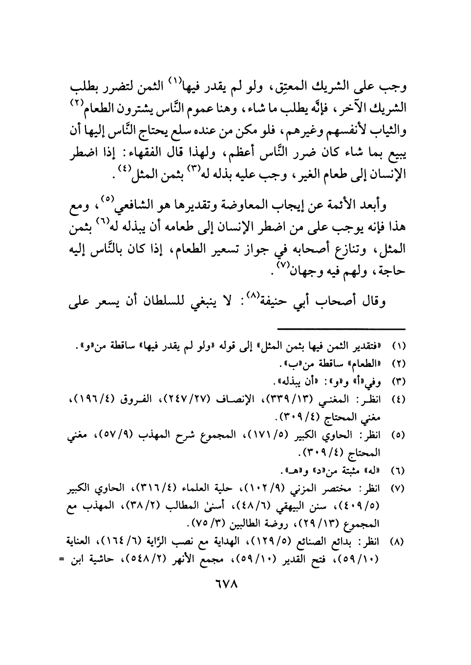 وجب على الشريك المعتِق، ولو لم يقدر فيها (¬١) الثمن لتضرر بطلب الشريك الآخر، فإنَّه يطلب ما شاء، وهنا عموم النَّاس يشترون الطعام (¬٢) والثياب لأنفسهم وغيرهم، فلو مكن من عنده سلع يحتاج النَّاس إليها أن يبيع بما شاء كان ضرر النَّاس أعظم، ولهذا قال الفقهاء: اذا اضطر الإنسان إلى طعام الغير، وجب عليه بذله له (¬٣) بثمن المثل (¬٤).