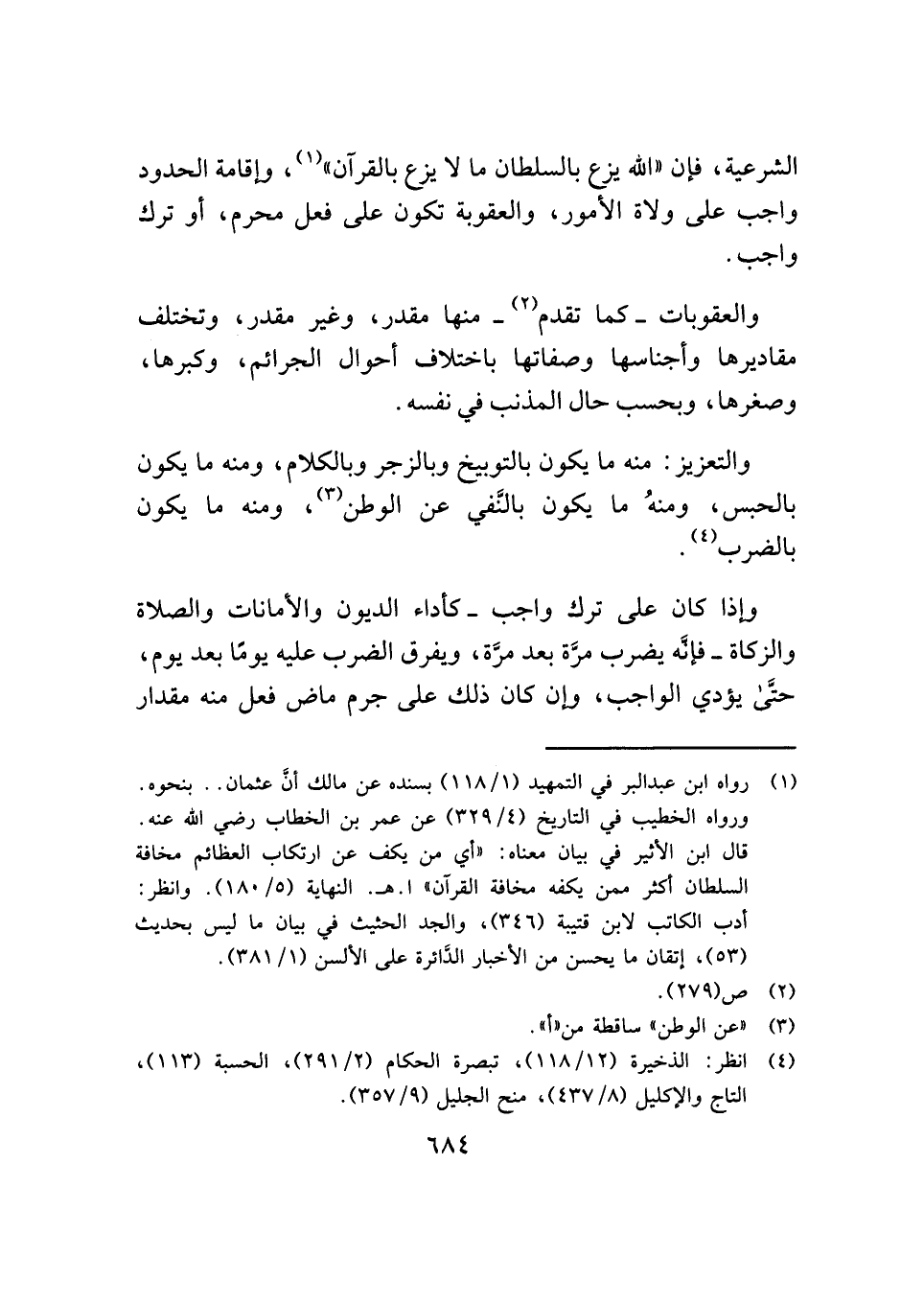الشرعية، فإن "الله يزع بالسلطان ما لا يزع بالقرآن" (¬١)، وإقامة الحدود واجب على ولاة الأمور، والعقوبة تكون على فعل محرم، أو ترك واجب.
