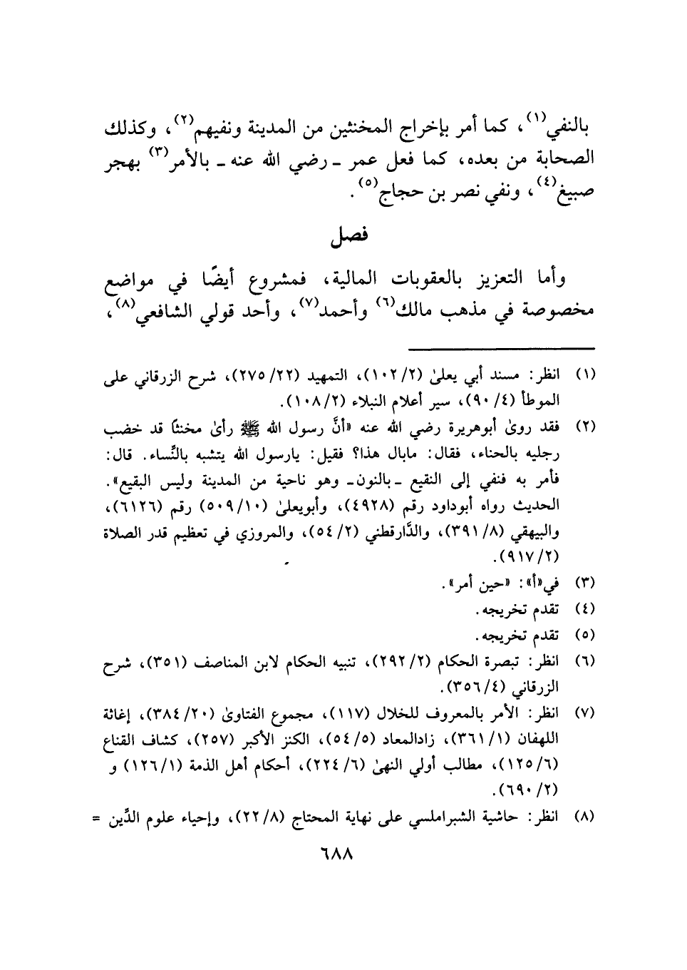 (¬٢) فقد روى أبو هريرة رضي الله عنه "أنَّ رسول الله - صلى الله عليه وسلم - رأى مخنثًا قد خضب رجليه بالحناء، فقال: ما بال هذا؟ فقيل: يا رسول الله يتشبه بالنَّساء. قال: فأمر به فنفي إلى النقيع - بالنون - وهو ناحية من المدينة وليس البقيع". الحديث رواه أبو داود رقم (٤٩٢٨)، وأبو يعلى (١٠/ ٥٠٩) رقم (٦١٢٦)، والبيهقي (٨/ ٣٩١)، والدَّارقطني (٢/ ٥٤)، والمروزي في تعظيم قدر الصلاة (٢/ ٩١٧).